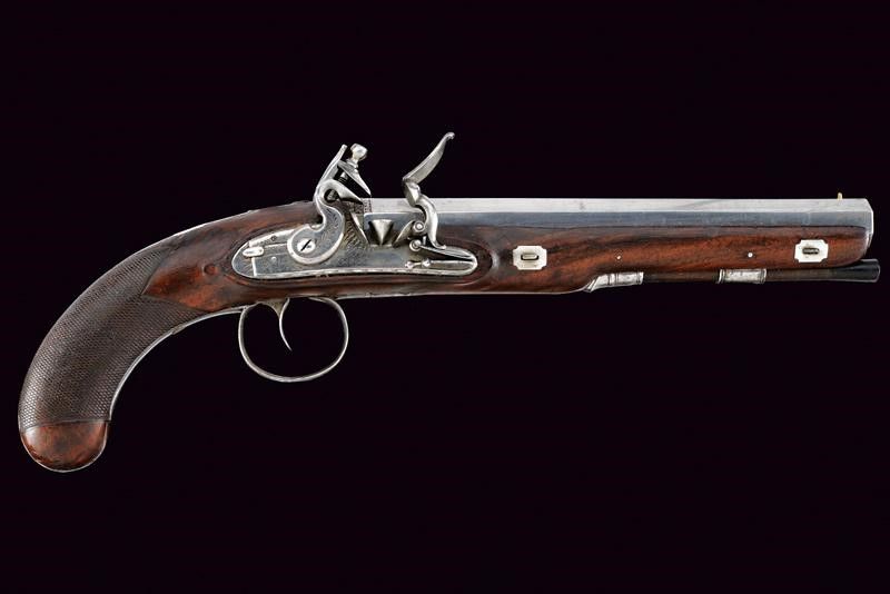 Cheltenham, lunghezza 38.5 cm. Canna liscia ottagonale con incisione 'CHELTENHAM', dotata di culatta con doppia cornice incisa, volata con mirino, cal. 14 mm. Codetta incisa e munita di alzo. Batteria a pietra focaia firmata 'W&S ROOKE', finemente incisa e munita di sistema antifrizione, a tenuta stagna e con sicura. Cassa intera in legno con calcio zigrinato. Fornimenti in ferro inciso. Bacchetta in legno con battipalla in corno.