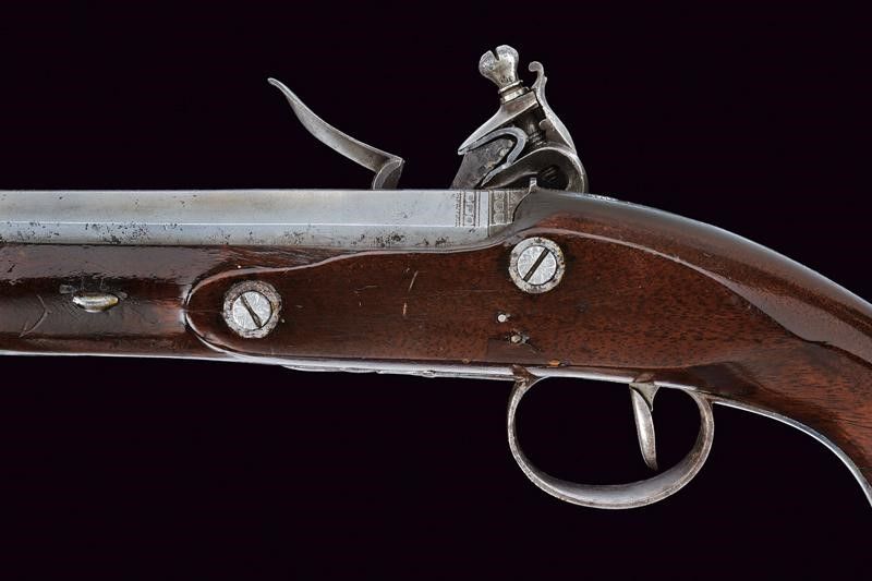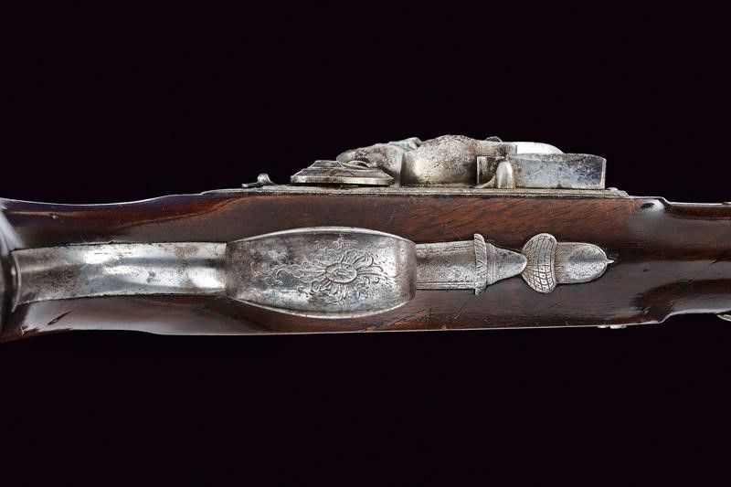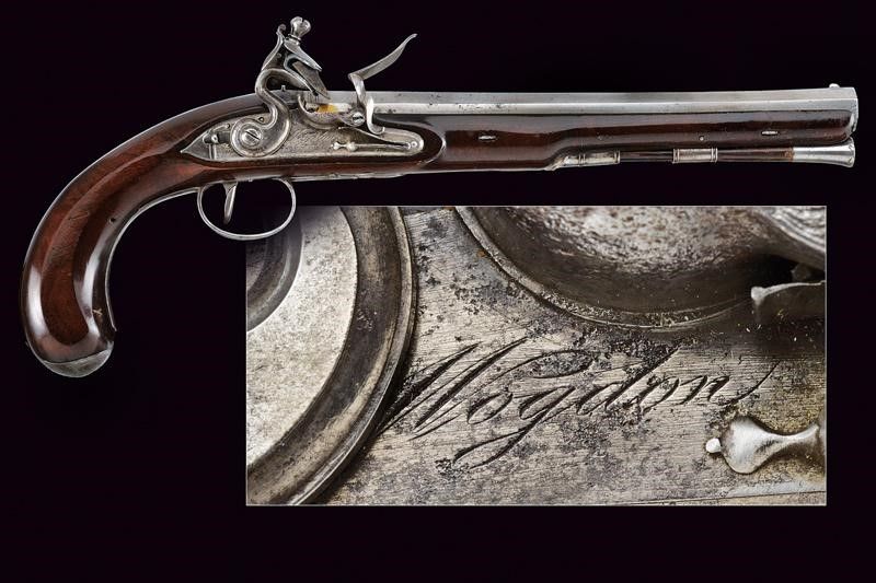 Londra, lunghezza 38.5 cm. Lunga canna liscia ottagonale con cornice alla base firmata 'Wogdon', mirino in argento, cal. 14 mm. Codetta incisa e munita di alzo. Batteria a pietra focaia firmata 'Wogdon' munita di sicura. Cassa intera in legno (piccoli difetti) con fornimenti in ferro inciso a motivi floreali. Bacchetta in legno con battipalla in ferro.