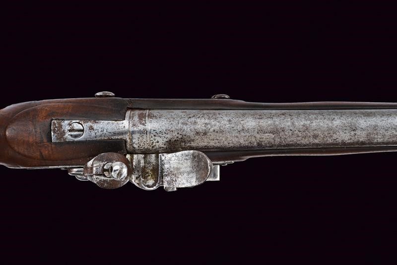 Regno Unito, lunghezza 38,3 cm. Canna tonda liscia con anellatura di rinforzo in culatta, lunga 9', cal. 17,1 mm. in volata. Resti di due punzoni non chiaramente leggibili. Batteria a cartella piana con corona sormontante le iniziali 'GR' (Giorgio III o Giorgio IV), punzone 'broad arrow' sormontato da corona e 'TOWER' sulla codetta. Meccanica funzionante. All'interno 'NM' e '3' sormontato da corona. La meccanica in stato di conservazione migliore rispetto all'esterno. Cassa intera in legno con piccola riparazione sotto alla volata. Fornimenti in ottone. Bacchetta in ferro. Sul tipo del raro '1805 Pattern Short Sea Service'.