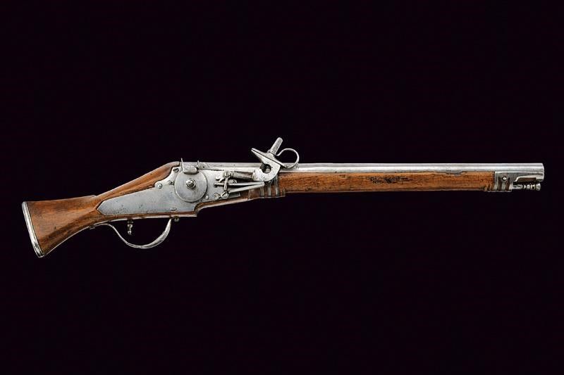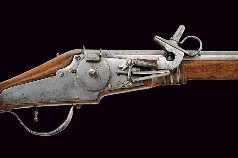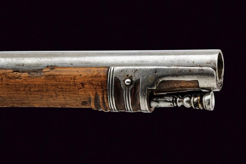 Lunga canna liscia a due ordini, prima ottagonale con punzone 'G' alla base, poi tonda, con anellatura al cambio, cal. 13 mm. Codetta liscia angolata. Batteria a ruota esterna e cartella piatta, il cane dotato di anello, scodellino con copriscodellino scorrevole. Cassa intera in legno di noce (piccole mancanze) decorata con tarsie floreali in filigrana. Fornimenti in ferro, il ponticello costolato. Bacchetta in legno con battipalla in ferro intagliato e traforato.