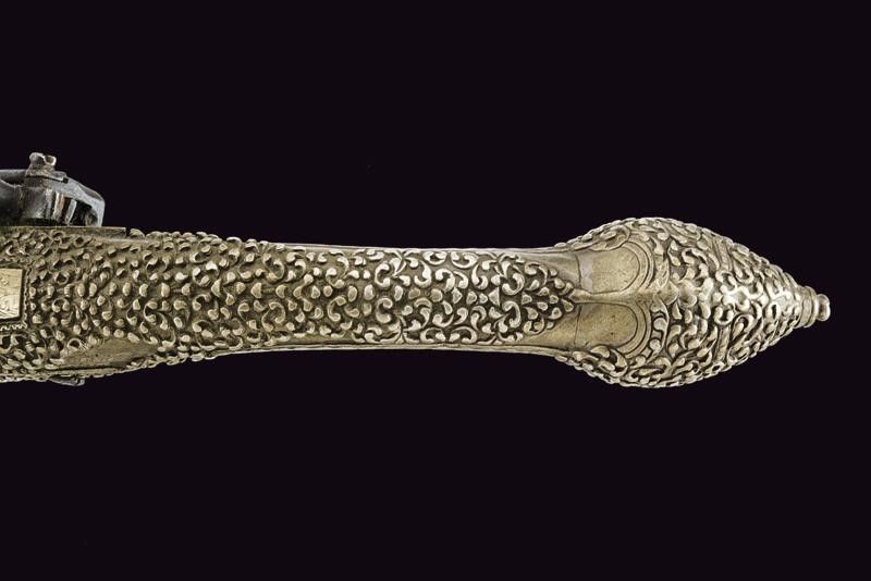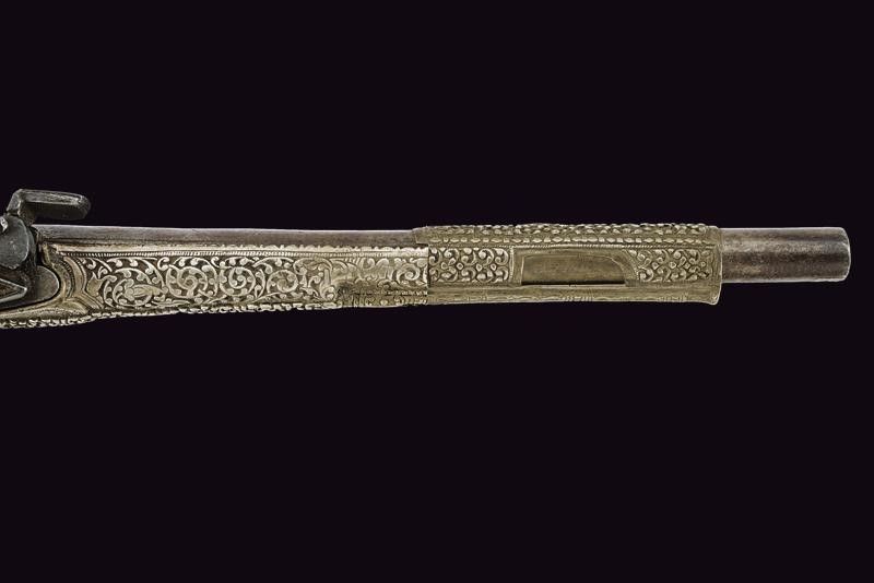 Turchia, lunghezza 48 cm. Prima metà del XIX Secolo Canna tonda liscia, con base quadra recante un punzone rimesso in ottone e sobrie incisioni, cal. 14 mm; codetta rivestita in ottone e munita di traguardo. Batteria alla micheletta con tracce di incisioni. Cassa completamente in argento, riccamente decorata a motivi floreali in bassorilievo (piccola mancanza). Ponticello inciso.