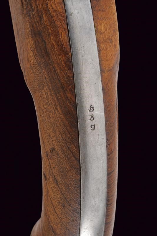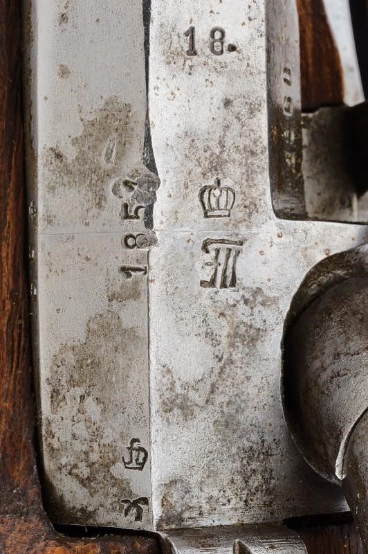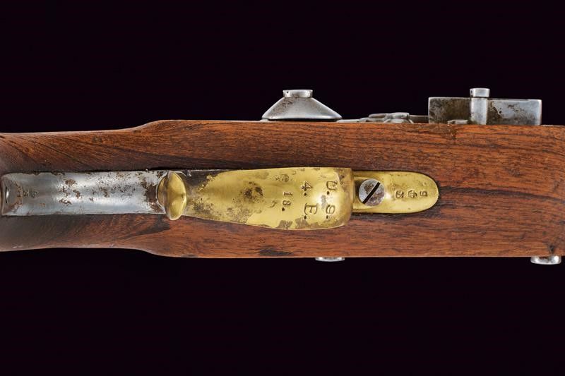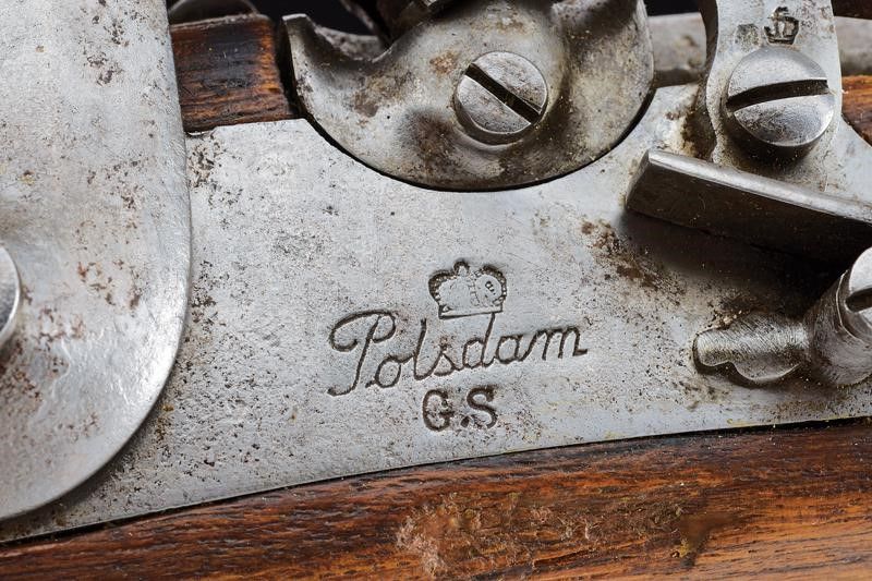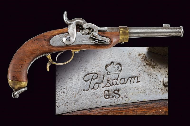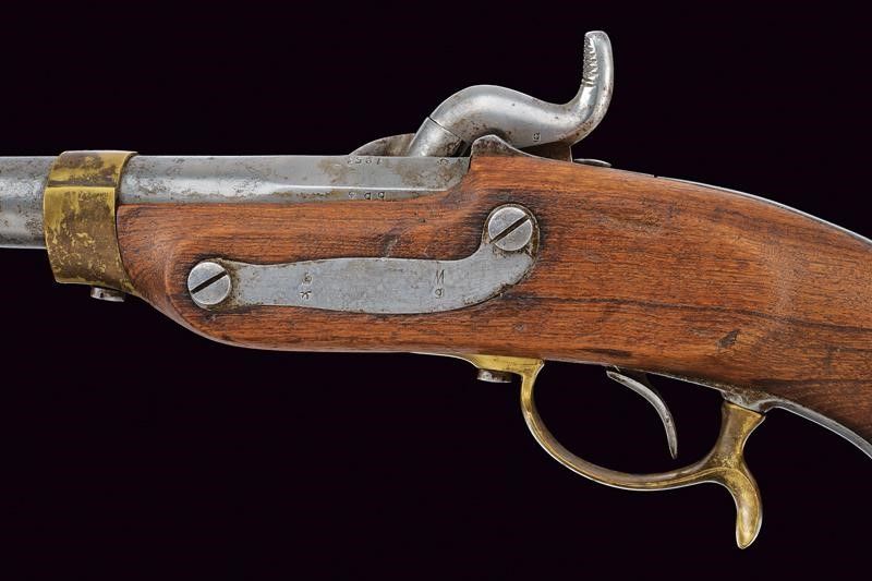 Germania, lunghezza 39 cm. Canna tonda con gioia di bocca e base ottagonale, marcata '1853', '1860' e con diversi punzoni, dotata di mirino, cal. 15.5 mm. Batteria a molla in avanti marcata 'Potsdam GS' sotto corona e dotata di sicura. Cassa in legno (ripulita) con fornimenti in ottone, il ponticello marcato 'U. 9. 4. E. 18.', l'anello di sospensione in ferro.