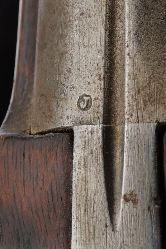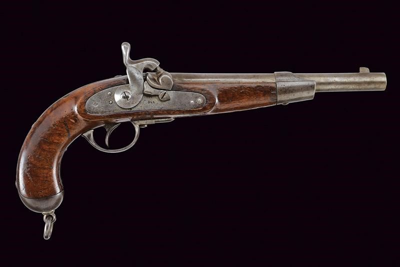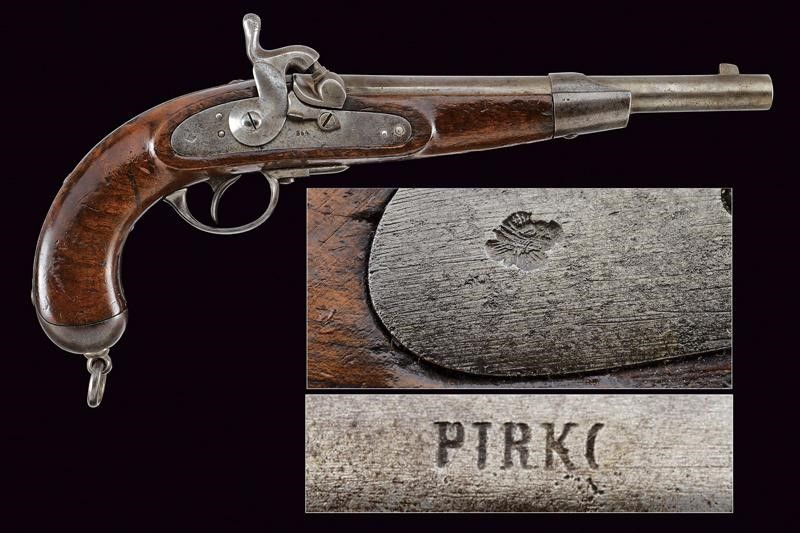 Austria, lunghezza 41.5 cm. Canna tonda rigata, marcata 'PIRKO', sulla culatta punzoni 'R' e 'J' con scanalatura centrale, cal. 13,9 mm; batteria a molla in avanti, datata '864' e punzonata con aquila bicipite, sicura; cassa a tre quarti in legno (timbri), con fornimenti ed anello porta correggiolo in acciaio.