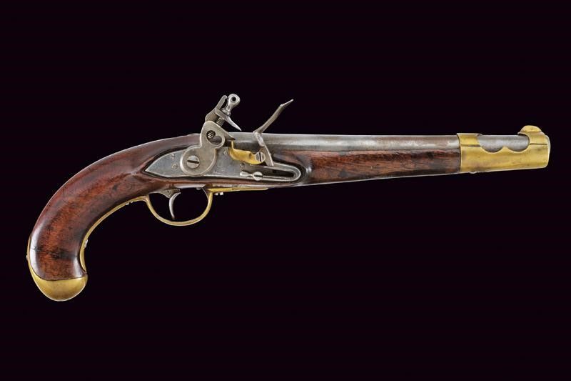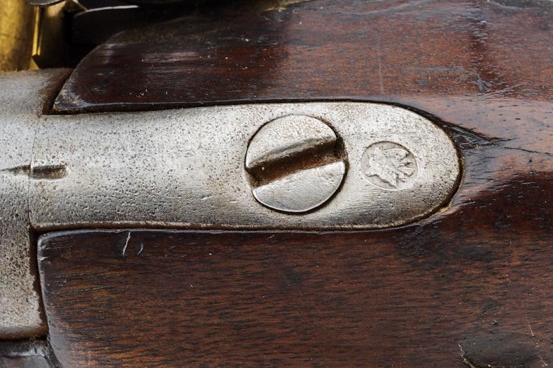 Austria, lunghezza 43 cm. Canna tonda liscia, con base quadra, cal. 17.6 mm; codetta liscia con punzone imperiale; batteria a pietra focaia con scodellino in ottone. Cassa intera in legno (piccolo restauro vicino alla coccia) e fornimenti in ottone. Meccanica da rivedere.