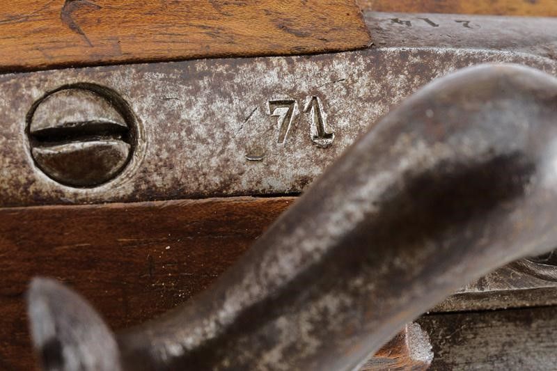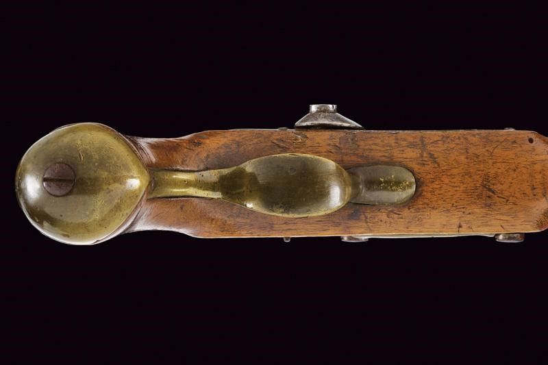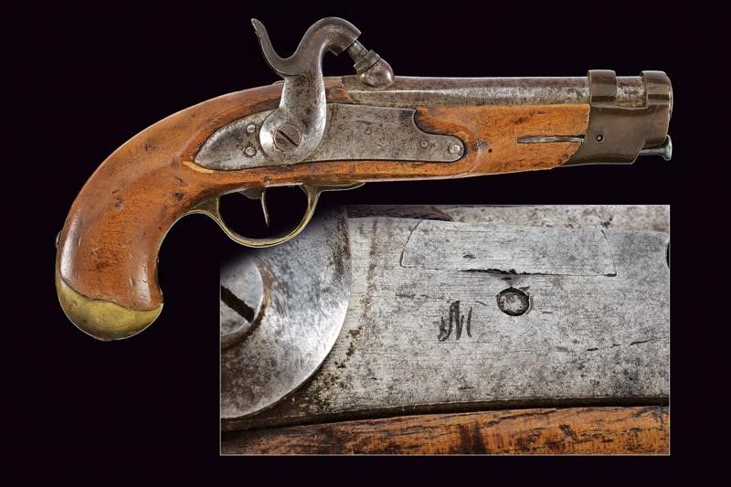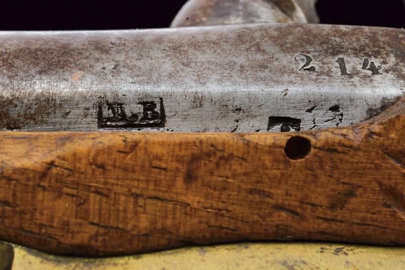 Stato Pontificio, lunghezza 24 cm. Canna liscia tonda con culatta ottagonale marcata con numero '214', 'M.B' e con un altro punzone poco visibile, cal. 15 mm. Codetta con numero '71'. Batteria ridotta a luminello con resti di marcatura 'GM' per Mazzocchi (la lettera G poco visibile). Cassa in legno (stessa matricola, piccoli difetti) con fornimenti in ottone e bacchetta in ferro.