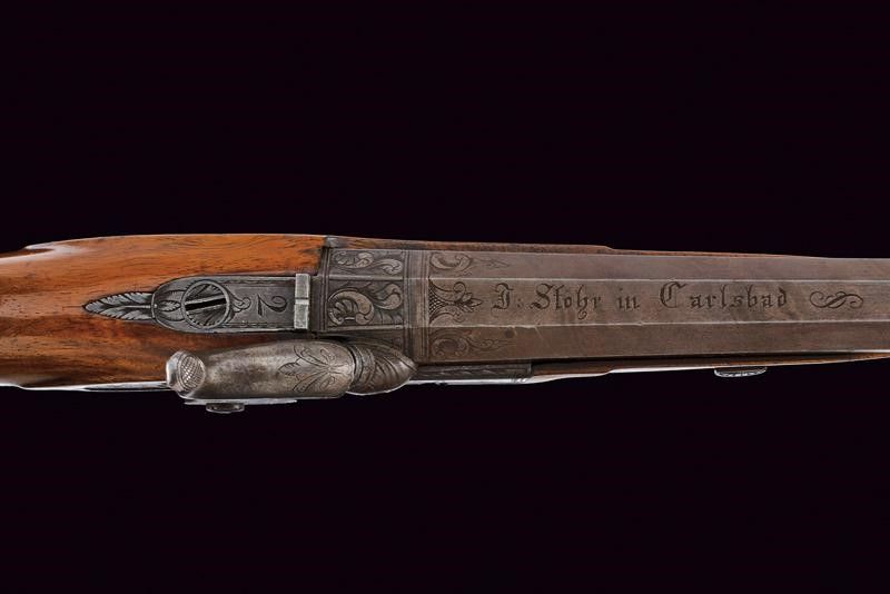 Baden, lunghezza 43 cm. Canna ottagonale con lieve microrigatura, recante resti di brunitura probabilmente antica, firmata al dorso 'J. STÖHR IN CARLSBAD', incisa alla base a fiorami e con cornicetta in volata, dotata di mirino, cal. 11,2 mm. in volata. Culatta incisa a rocaille. Codolo numerato '2' e munito di alzo fisso. Batteria a molla in avanti con cornicetta incisa sulla piastra e fiorami, presenti anche al collo del cane. La testa del cane incisa con volto grottesco. Cassa a tre quarti in legno con collo zigrinato. Il muso con intaglio a palmetta e riccio. Fornimenti in ferro. Bella contropiastra sagomata e incisa a effigiare un drago. Coccia piana ellittica (leggermente lasca) recante trofeo inciso. Ponticello con poggiadito e incisioni floreali. Grilletto e stecher ben funzionanti. Vite di regolazione.