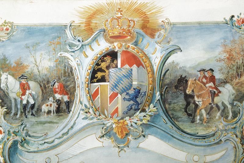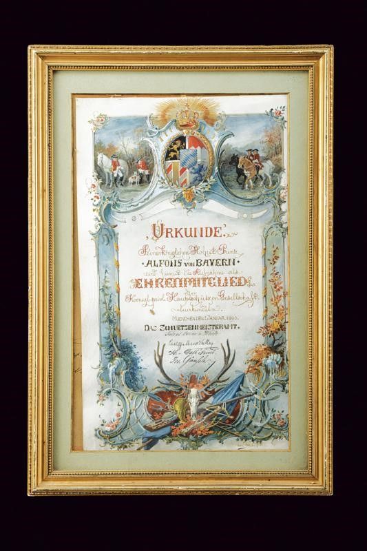 Monaco di Baviera, dimensioni 36.2 x 53.8 cm. 1893 Documento da membro d'onore della Reale Privilegiata Società dei Tiratori per il trentunenne principe Alfons von Bayern il 1° Gennaio 1893, con quattro firme fra le quali 'Fürst Oscar v. Wrede'. Tutto il documento in pergamena finemente dipinta dal pittore Karl Döttl (firma in basso a destra); recante in alto lo stemma bavarese sormontato da corona e posto fra due miniature effigianti scene di caccia, in basso un grande trofeo e decorazioni floreali. In cornice, passe-partout e sotto vetro. Di buona qualità .