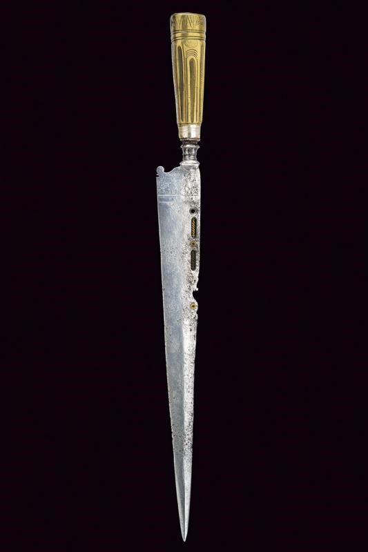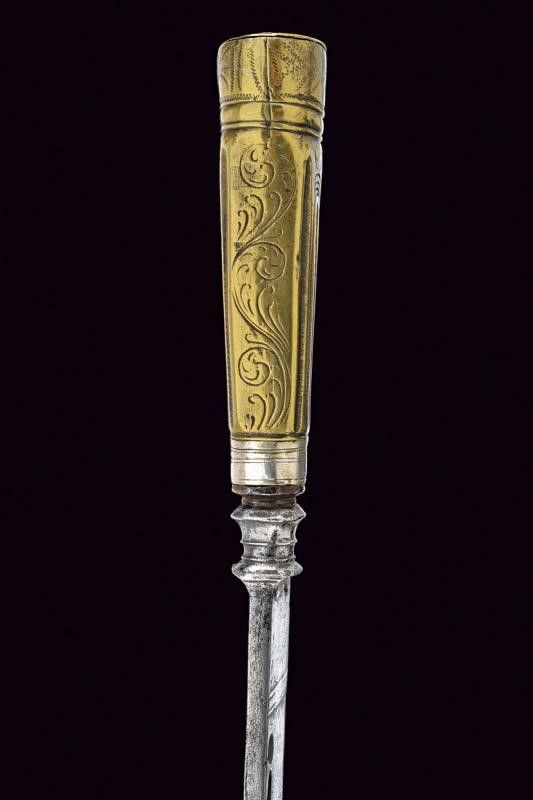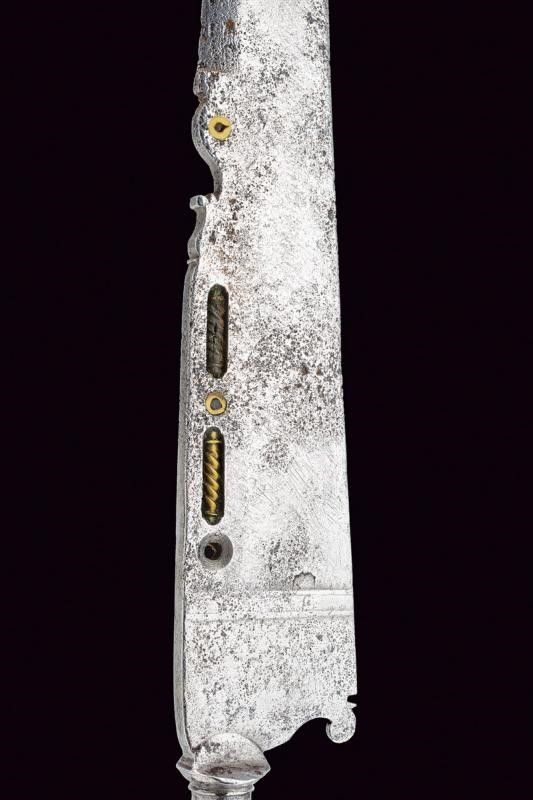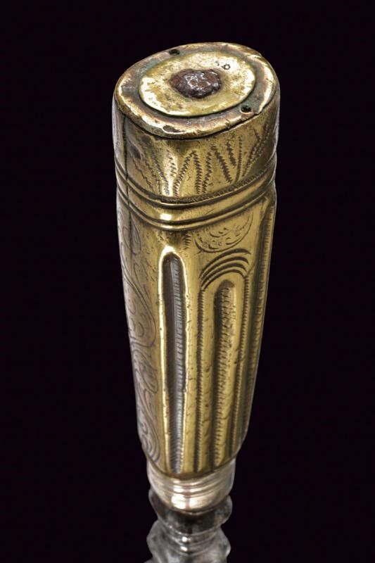 Lunga lama dritta (con zone intaccate) a un filo e controfilo, con dorso intagliato al cambio, base con tarsie in ottone. Impugnatura in ottone decorata a scanalature con incisioni floreali. Ghiera in argento.