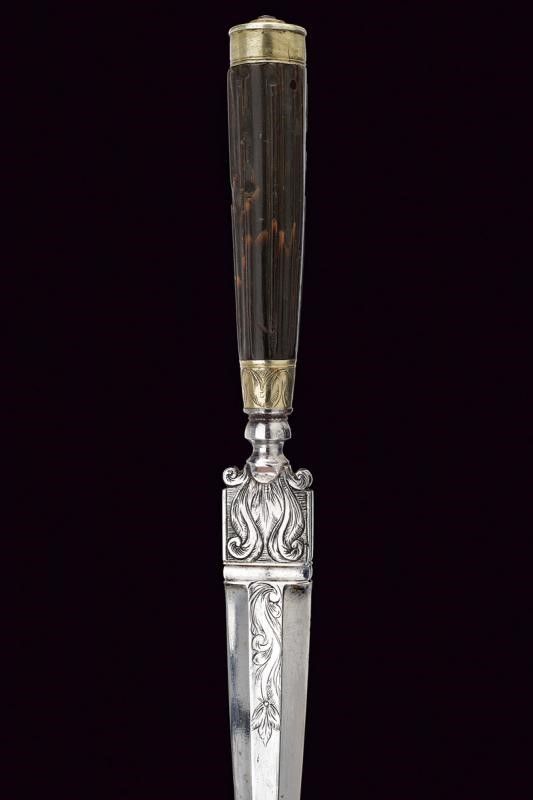 Italia meridionale, lunghezza 28 cm. Robusta lama in acciaio a due fili, sgusciata al centro ed incisa a motivi floreali; il tallone inciso e intagliato a riccioli. Impugnatura in corno (mancanze) con ghiera e cappa in metallo bianco inciso. Fodero in cuoio con fornimenti decorati en suite.