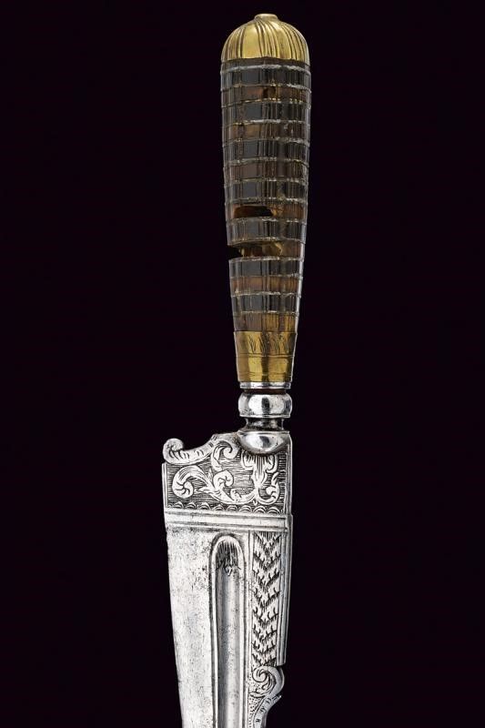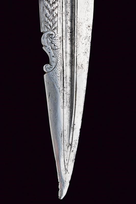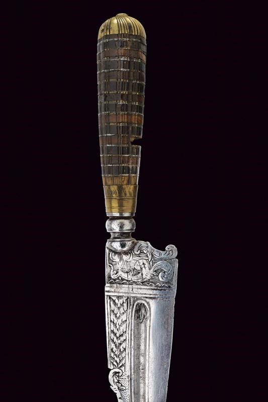 Italia meridionale, lunghezza 28 cm. Lama di forma triangolare a a un filo e controfilo con punta leggermente rilevata, scanalatura centrale, dorso intagliato e nervato, la base incisa a motivi floreali. Nodo in ferro. Impugnatura in corno a dischi (mancanze) con cappa e ghiera in ottone inciso. Fodero in legno rivestito di cuoio e dotato di fornimenti lisci in ottone.