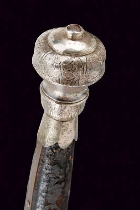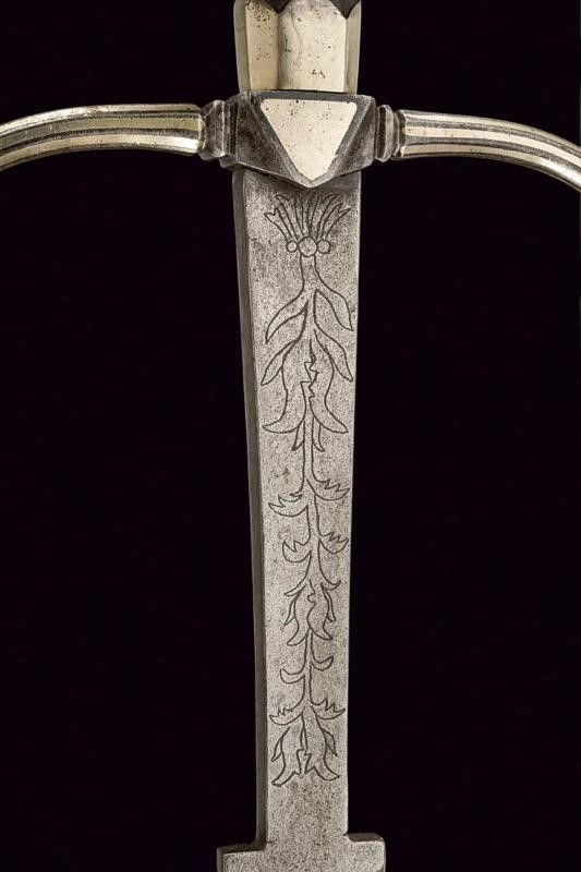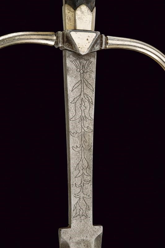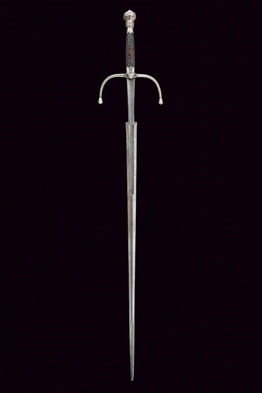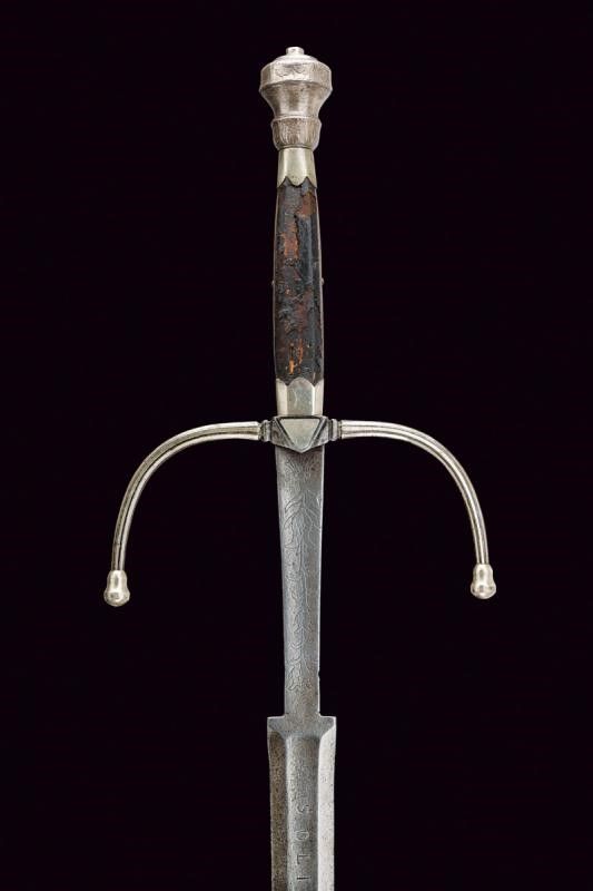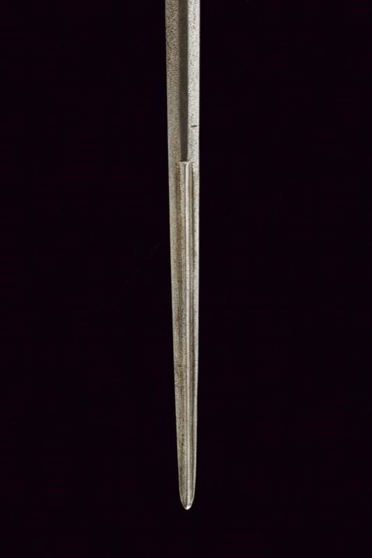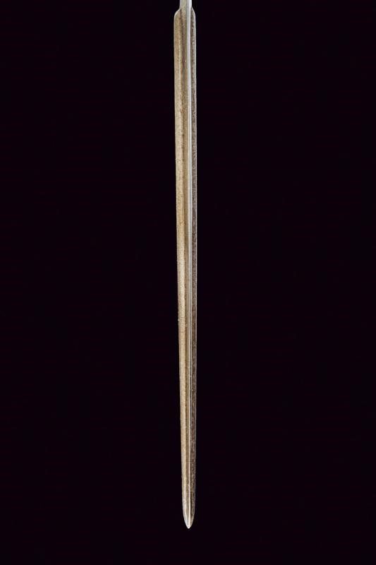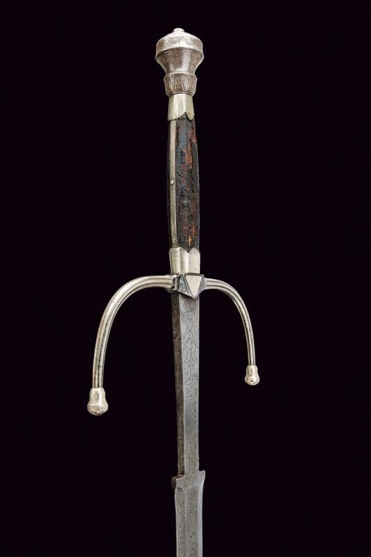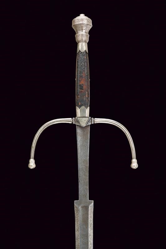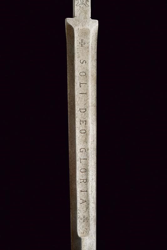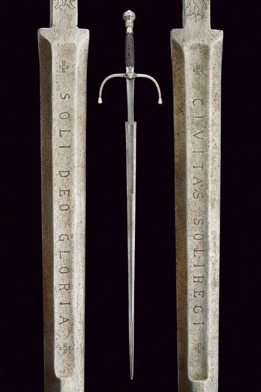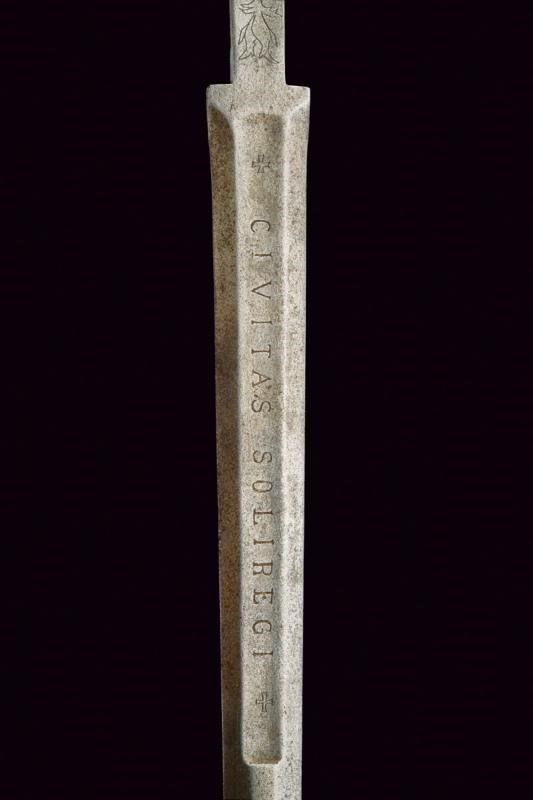 metà del XVI Sec. Lunga lama dritta a stocco, recante sguscio al forte con iscrizione 'CIVITAS SOLIREGI' su una faccia e 'SOLI DEO GLORIA' sull'altra, la parte centrale di sezione esagonale, la punta rinforzata con una nervatura. Lungo ricasso trapezoidale inciso a motivi floreali. Elso in ferro con bracci faccettati, incurvati verso la lama e decorati a bande in argento, dotati di testa a pera, sempre in argento; il massello triangolare e argentato. Pomo in argento con collo ristretto, liscio, ornato nell'area superiore e alla base con incisioni a foglie. Impugnatura in legno con resti di rivestimento in cuoio, le ghiere lisce, in lamina d'argento con bordo ondulato. I fianchi con doga piatta.