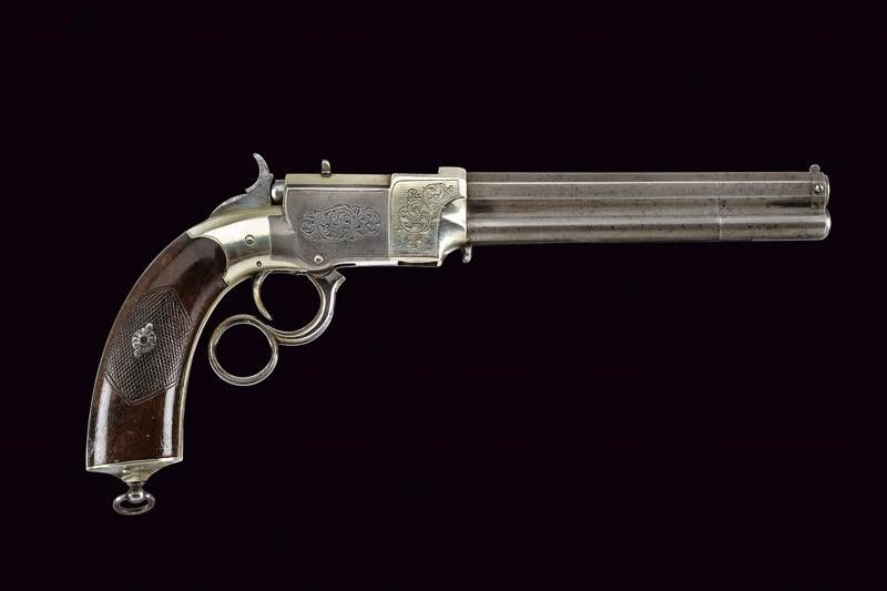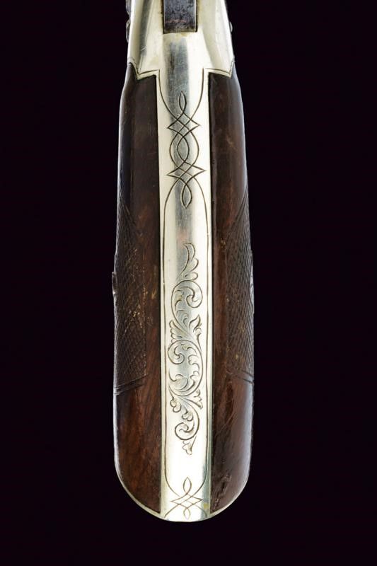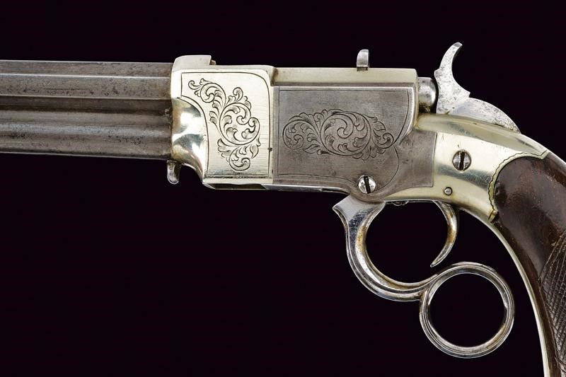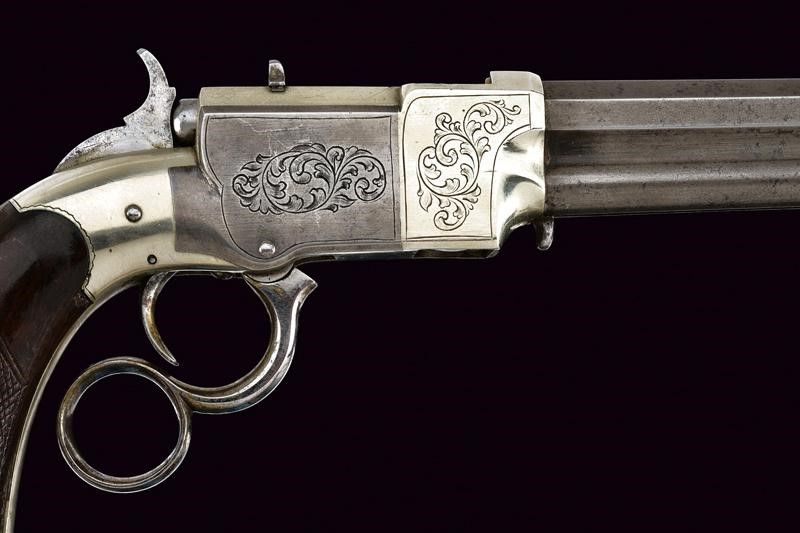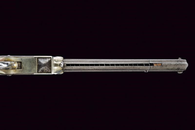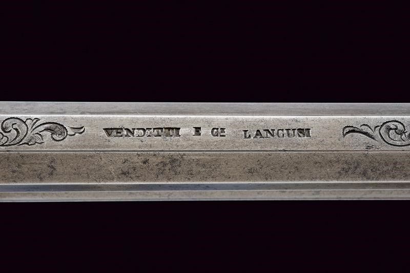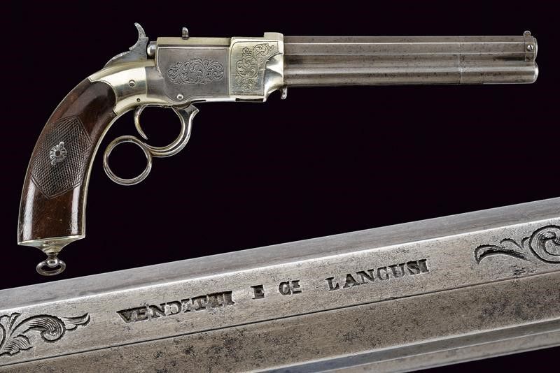 Canna faccettata, rigata (anima pulita, rigatura ancora visibile), in un unico pezzo con il serbatoio tubulare, marcata al dorso 'VENDITTI & C.I LANCUSI' tra fiorami, dotata di mirino, cal. 9 mm in volata, a percussione centrale. Il segmento anteriore di canna e il serbatoio ruotano per poter inserire le munizioni. Castello in metallo color alpacca finemente inciso a racemi e con due rosette a fiori, le lastre centrali in ferro decorato en suite. Ponticello a leva munito di anello. Impugnatura con guancette in legno zigrinato. Coccia di forma faccettata completa di anello porta correggiolo. Meccanica funzionante ma dura, da oleare.