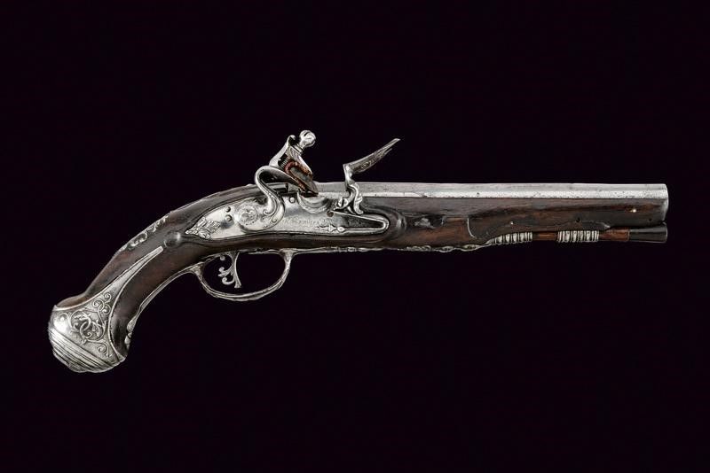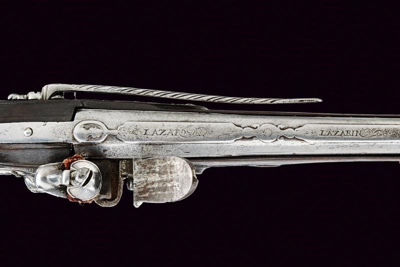Canna liscia tonda, con base quadra, recante un punzone sul lato sinistro, con bindella sagomata e con medaglione recante un busto alla base, firmata 'LAZARO LAZARIN', cal. 13 mm. Batteria a pietra focaia firmata 'PICIN FRUSCA', la codetta intagliata con fiorame, la vite del cane con un busto. Cassa intera in legno con bellissimi fornimenti in acciaio intagliati a busti, serpenti e a motivi floreali. Gancio da cintura lavorato a spire, piccoli difetti e mancanze. Bacchetta in legno con battipalla in corno. In patina. I fornimenti di buona qualità .