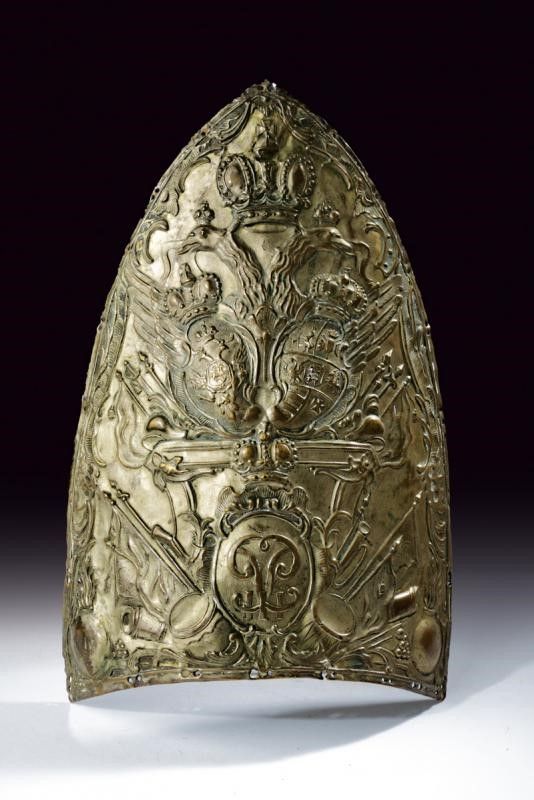 Russia imperiale, dimensioni 19 x 29.5 cm. Terzo quarto del XVIII Secolo In ottone con resti di argentatura, finemente sbalzata, con monogramma 'P III' sormontato da corone e fra trofei, più in alto la grande aquila imperiale, il bordo con granate e decorazioni floreali. Il margine con fori per il fissaggio.