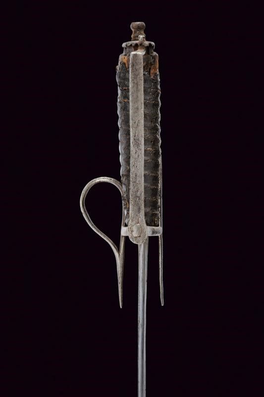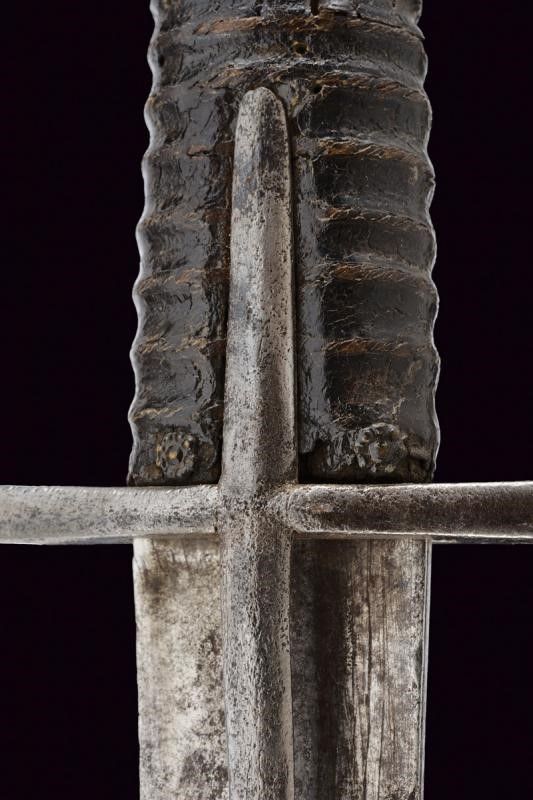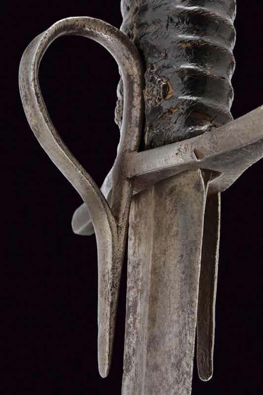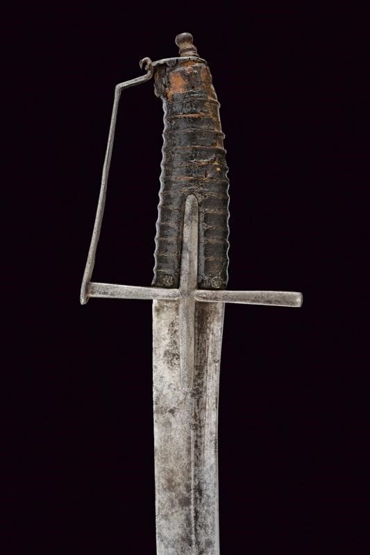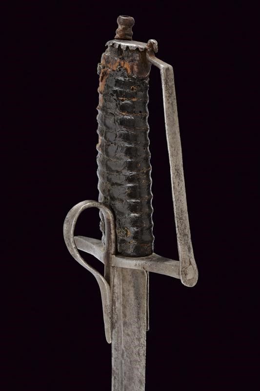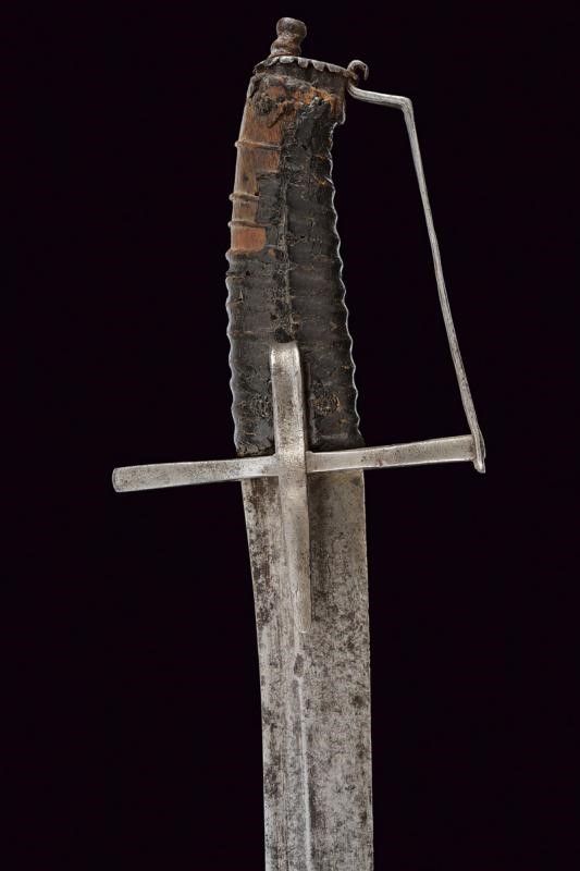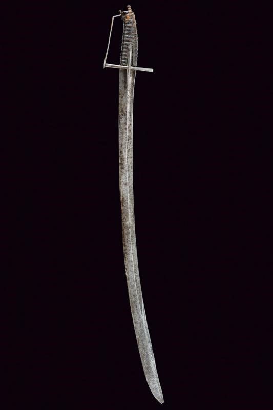 Europa orientale, lunghezza 91.5 cm. Lama di media larghezza, curva, a un filo e controfilo con sguscio sotto al dorso. Fornimento in ferro con elso munito di anello e alette fermafodero, ramo di guardia obliquo. Impugnatura in legno rivestita di cuoio (mancanze), decorato con piccoli rivetti a fiore, la cappa in ferro con grande bottone. Polacca o ungherese.