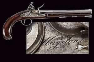 Londra, lunghezza 38.5 cm. Lunga canna liscia ottagonale con cornice alla base firmata 'Wogdon', mirino in argento, [..]