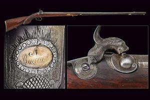 Italia, lunghezza 126.5 cm. Canne lisce tonde in damasco, munite di bindella e mirino, cal 17 mm. Codetta incisa, [..]