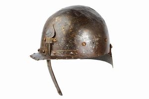 Germania, altezza 30 cm. 1620 circa Coppo lavorato in un unico pezzo a raggi, visiera alla massimiliana con fessure [..]