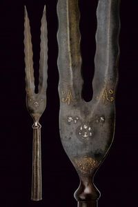 Siria, altezza 53 cm. fine del XVIII Sec. Ferro (probabilmente damasco) con duplici lame ondulate e punte rinforzate, [..]