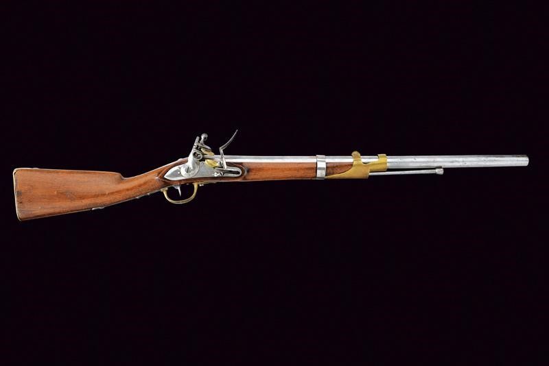 Stato Pontificio, lunghezza 99.5 cm. Canna liscia, tonda, con base ottagonale, cal. 18 mm. Batteria a pietra focaia marcata 'GM' con scodellino in ottone. Cassa intera in legno (piccolo difetto al codolo del calciolo) con fornimenti in ottone. Fascetta con mirino. Completo della rara barra con anello da sella. Bacchetta in ferro.