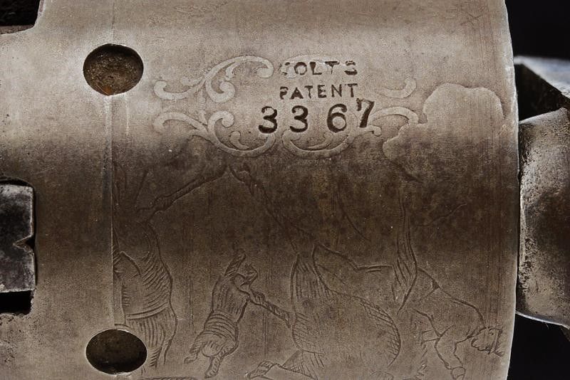 1848 Canna ottagonale da 4', con mirino conico in ottone, rigata (un po' di incrostazioni e pitting all'interno, rigatura visibile), con marcatura dorsale in due righe fra parentesi graffe 'ADDRESS SAM.L COLT / NEW-YORK CITY'. Cal. 31. Matricola della canna corrispondente al castello, il fermo a tre numeri, sempre coevi. Tamburo a cinque colpi con scena di combattimento a cavallo tra Rangers e nativi, recante cartiglio centrale con marcatura 'COLTSS / PATENT' e matricola coeva al resto. Fermi circolari. Castello con marcatura 'COLTS PATENT' sul fianco sinistro, matricola '33xx'. Meccanica funzionante. Bande dell'impugnatura in ottone numerate en suite. Ponticello squadrato. Impugnatura in noce.