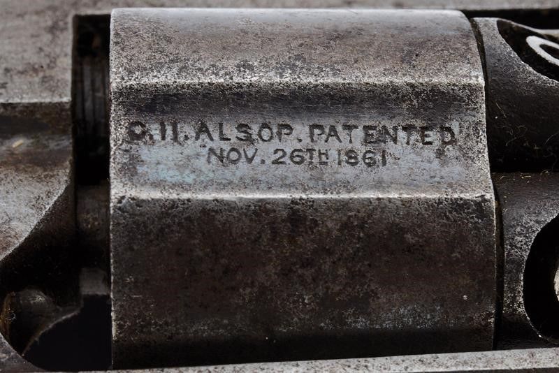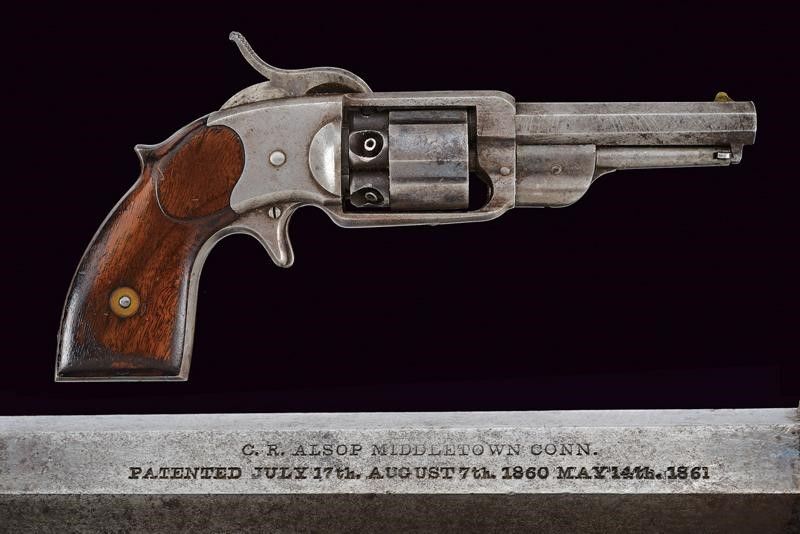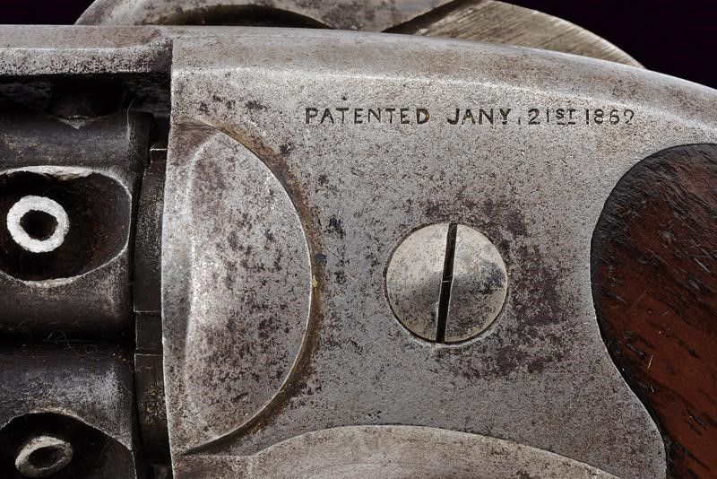 1862 - 1863 Canna ottagonale rigata da 4' (rigatura visibile, un po' di incrostazioni all'interno), con mirino in ottone, recante marcatura dorsale standard in due righe con brevetti fino al 1861, cal. 36. Tamburo a cinque colpi del tipo sgusciato con brevetti sino al 1861. Lievi tracce di brunitura antica. Meccanica funzionate, il blocco del tamburo con il cane tirato necessita di revisione. Castello con resti del brevetto del 1859, grilletto a sprone. Alcune intaccature. Matricola '3xx' sull'impugnatura, e il punzone 'G'. Guancette in noce. Qualche elemento con lievi tracce di finitura.
