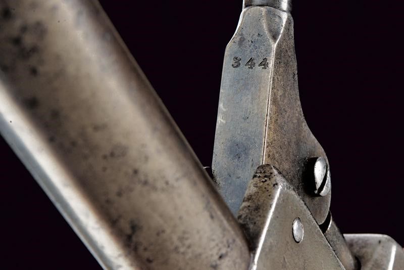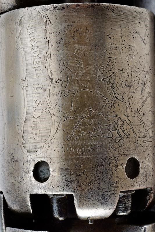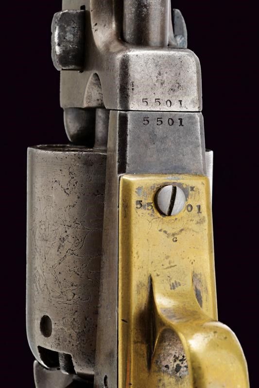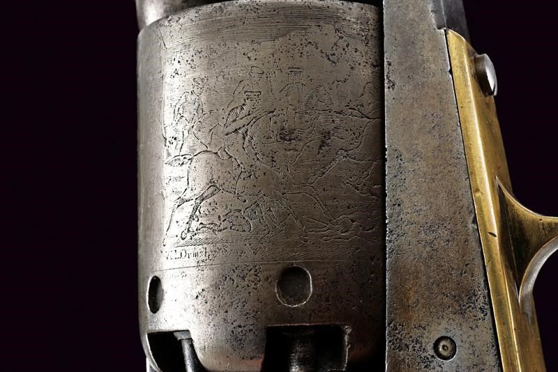 1849 Canna cilindrica da 7-1/2' (segni d'uso e del tempo all'interno, rigatura visibile) con base ottagonale, dotata di basso mirino color argento, marcata fra parentesi graffe 'ADDRESS SAM.L COLT NEW YORK CITY' con lettura verso la volata, cal. 44. Il calcatoio marcato '344'. Fermo della canna senza numeri. Tamburo liscio a sei colpi con tacche ovali, recante resti di incisione con scena di combattimento fra Texas Rangers e Indiani, ancora abbastanza leggibile, e i cartigli con le iscrizioni 'MODEL U.S.M.R' e 'COLT'S PATENT'; resti di matricola probabilmente '55xx'. Meccanica funzionante. Castello marcato 'COLTS PATENT' e 'U.S.' con matricola '55xx' coeva al tamburo; il perno centrale del tamburo con matricola parziale coeva al castello e timbri 'N' o 'Z' non chiaramente leggibili. Banda inferiore e ponticello (del tipo squadrato) in ottone con matricola in quattro cifre coeva al castello, recante anche i punzoni 'K' e 'G'. Banda dorsale in ottone con matricola coeva sotto all'impugnatura. Lievi tracce di argentatura sull'ottone. Anche la canna con matricola coeva al castello. Varie zone di pitting. Impugnatura liscia in noce senza timbri.