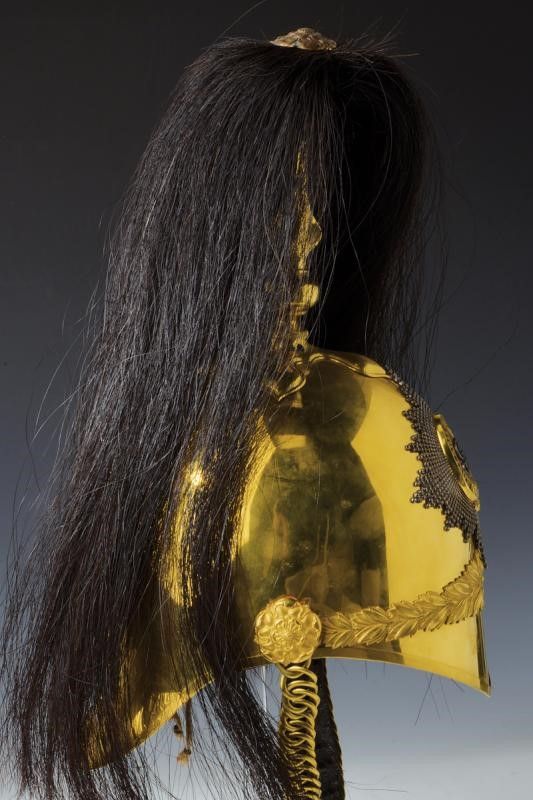 Inghilterra, altezza 38 cm. 1917 - 1936 Coppo in metallo dorato, puntale dorato su base a croce con crine nero. Fregio frontale del 2°Dragoon Guard (Queen's Bays) con monogramma di re Georgio V. Completo di tutti gli effetti. L'interno con fodera in seta con danni d'uso, il resto in bellissime condizioni.