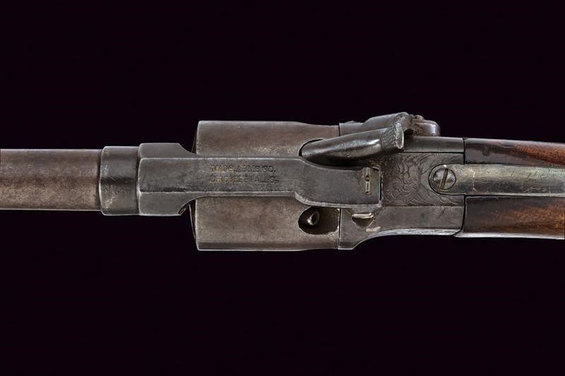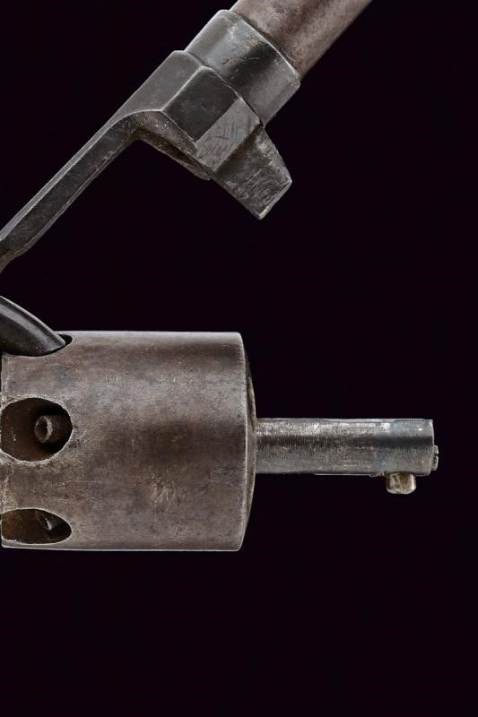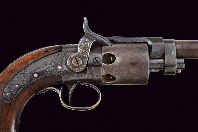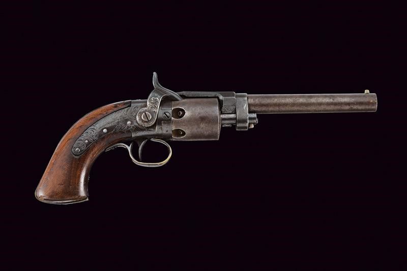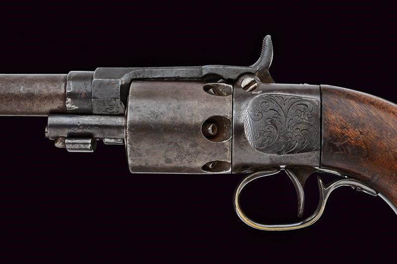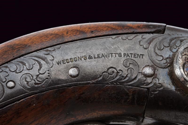 USA, lunghezza 26 cm. 1850 circa Canna da circa 5' dotata di mirino, cal. 31. Marcatura dorsale con indirizzo della Massachussets Arms Company e tacca di mira. Tamburo a sei colpi, liscio e privo di marcature, con incisioni a fiorami e lievi tracce di brunitura color blu. Meccanica funzionante. Batteria con marcatura del brevetto Wesson 6 Levavitt. Ponticello e bande dell'impugnatura in ottone argentato. Tipico sistema di basculamento dorsale della canna con gancio che si fissa al perno del tamburo.
