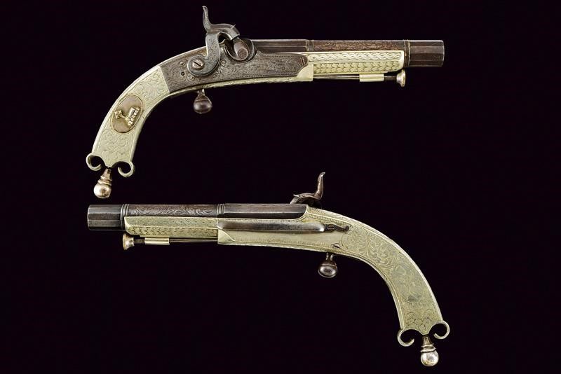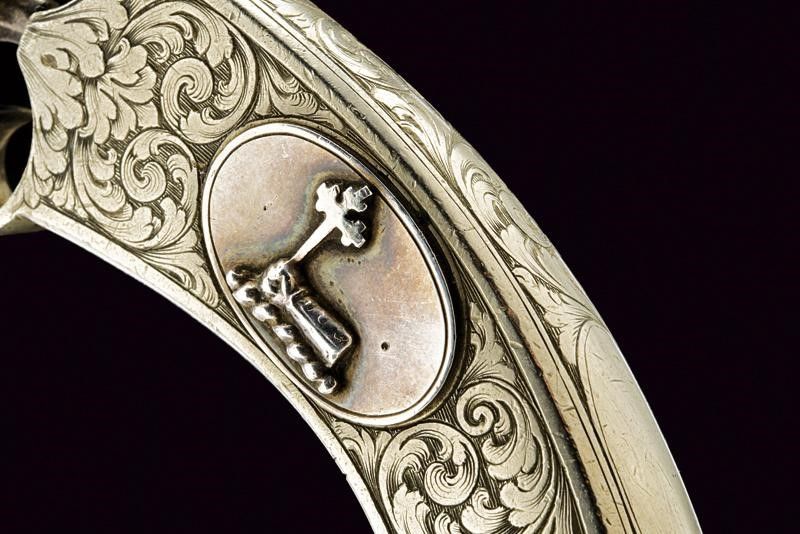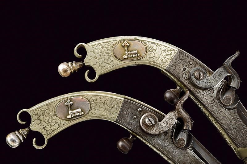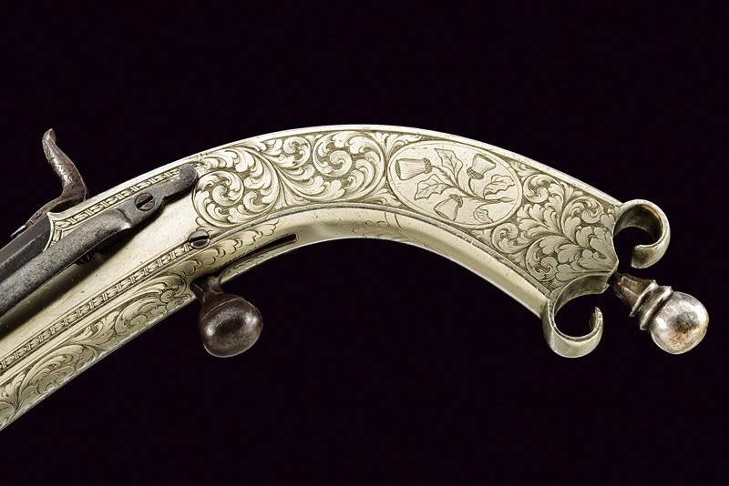Scozia, lunghezza 26 cm. Canne lisce a tre ordini, prima a undici facce parzialmente incise, poi con un segmento tondo ed inciso a motivi floreali, infine un tratto a undici fasce lisce, cal. 12 mm. Batterie a molla in avanti firmate 'CAMPBELL' ed incise a motivi floreali; casse in argento e finemente incise con cardo fra fiorami e bande intrecciate. Il lato destro dell'impugnatura con scudetto in argento recante una croce su un guanto in bassorilievo. I grilletti a sfera; ganci da cintura in ferro. Bacchette in ferro con battipalla in metallo bianco.