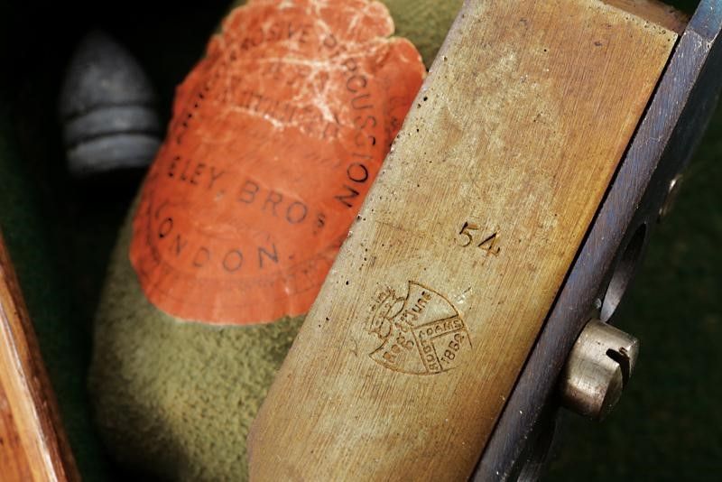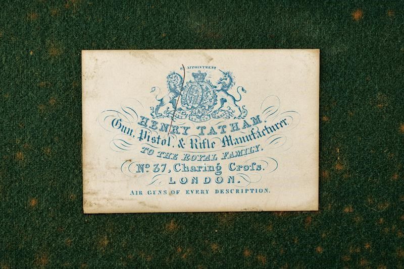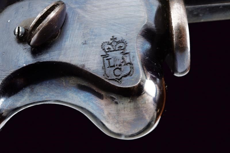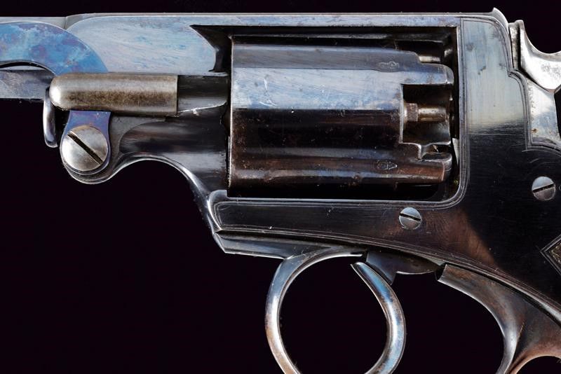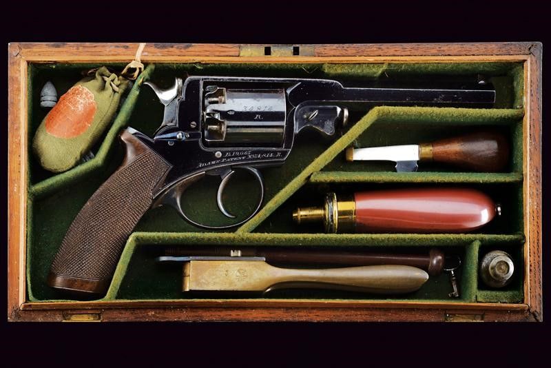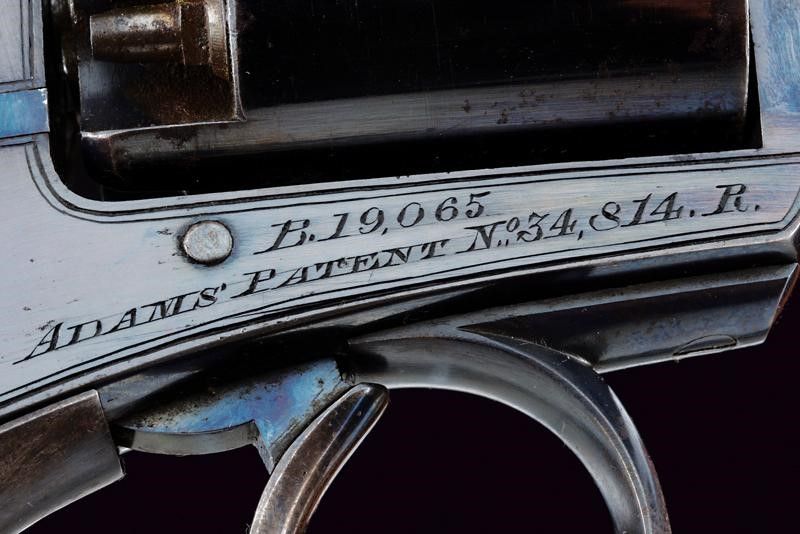Canna ottagonale, rigata, con alzo e mirino, cal. 11 mm; tamburo liscio a cinque colpi con punzoni del banco di prova di Londra. Castello delineato al bordo, marcato 'ADAM'S PATENT No. 3504' e con marca 'LAC' sotto corona entro uno scudetto. Sicura. Bellissima brunitura originale, al 95 %. Calcio in legno zigrinato, coccia in ferro. In cassetta di legno foderata in panno verde all'interno e recante etichetta di Henry Tatham a Londra, dotata di diversi accessori.