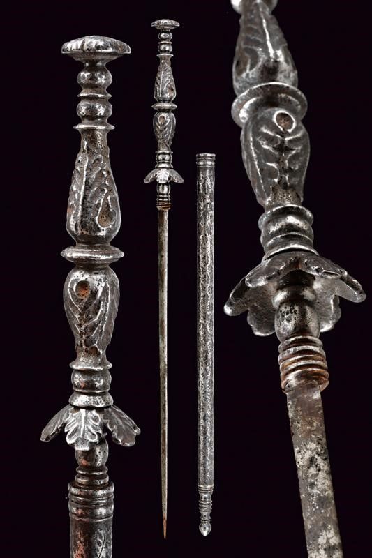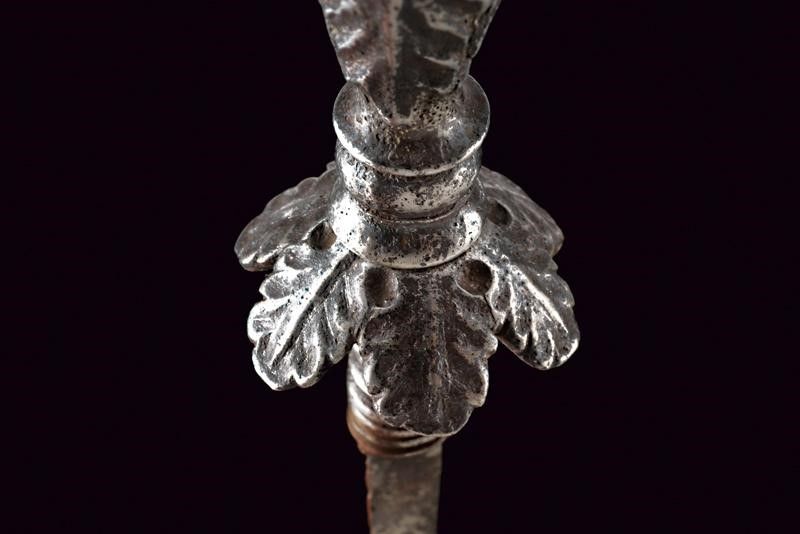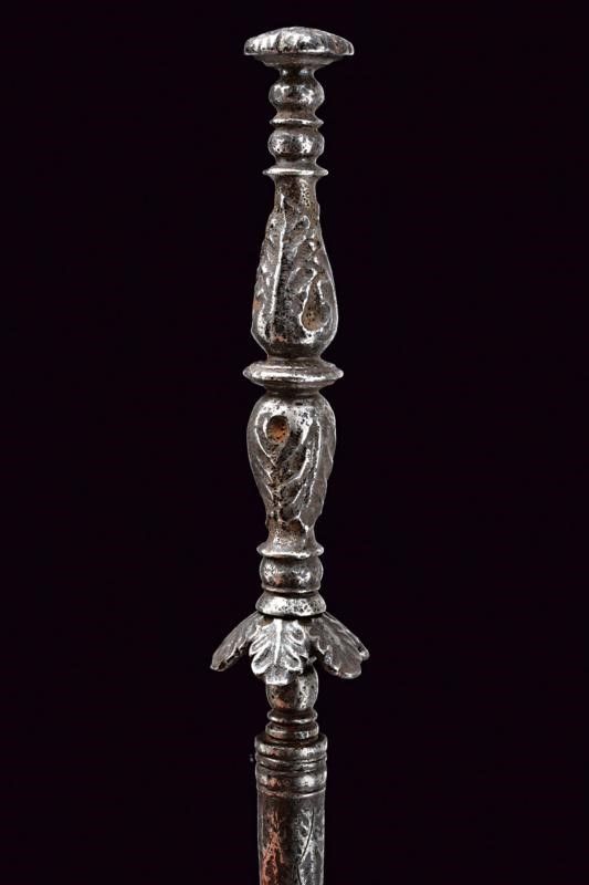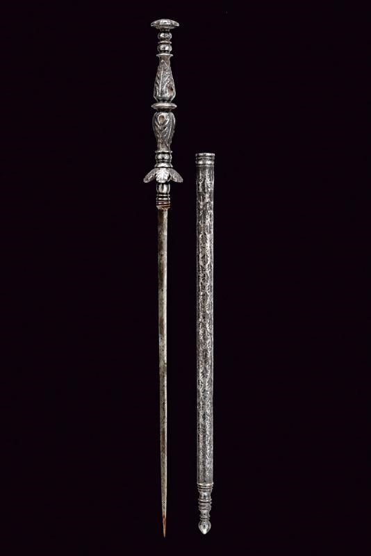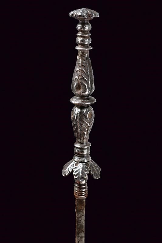 Italia, lunghezza 33.7 cm. XVII Secolo Lunga e sottile lama di sezione triangolare, la base con nodo ad oliva. Fornimento in ferro massiccio con elso composto da sei petali. Pomo ed impugnatura intagliati a fogliame. Fodero avvitabile, in ferro, di forma cilindrica, finemente inciso a motivi floreali.