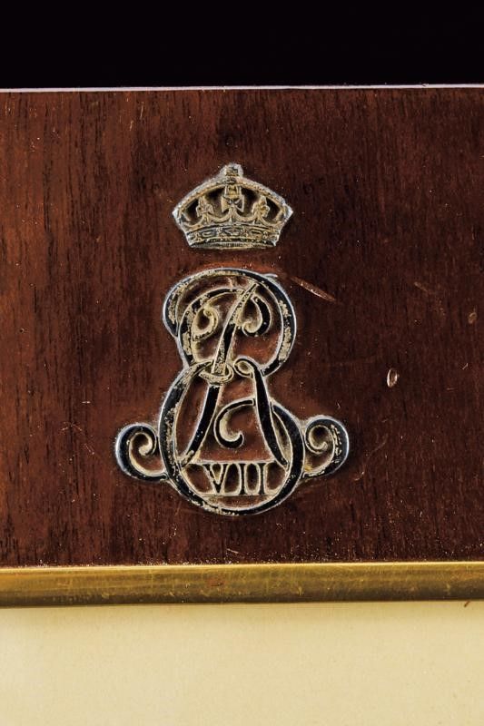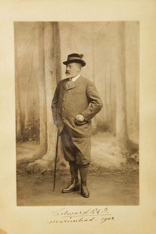 1908 Foto de Re in abiti civili, scattata in un bosco, firmata 'Edward Marienbad - 1908'. In cornice lignea con monogramma del Re in metallo, completa del vetro.