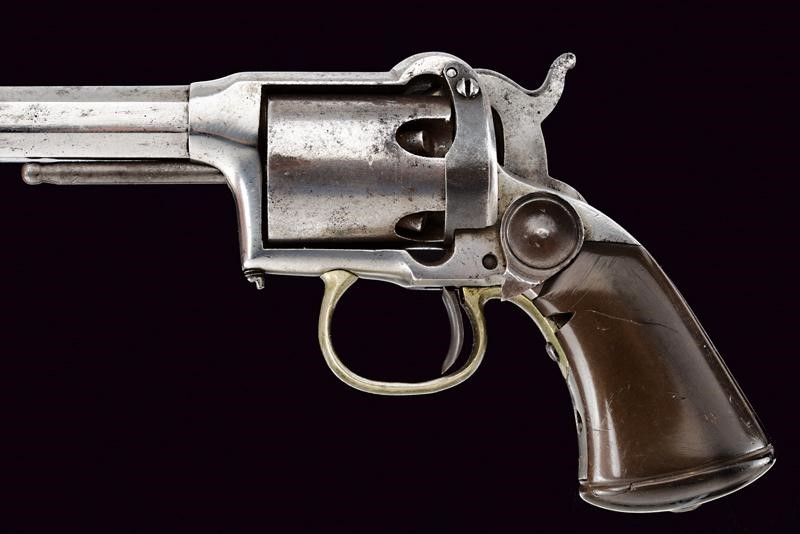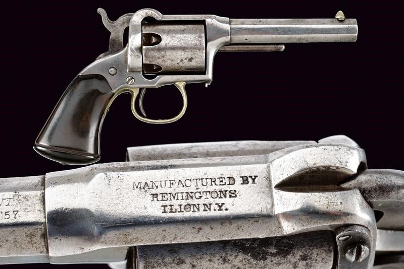 USA, lunghezza 16,5 cm. 1857 - 1858 Canna ottagonale rigata dotata di mirino, recante marcatura dorsale con brevetti Beals sino al '57, cal. 31. Tamburo liscio a cinque colpi, il perno lungo e con terminazione sferica (?). Meccanica parzialmente funzionante (cane e grilletto in ordine, manca parte del braccetto di trasmissione al tamburo). Matr. '5xx' all'interno dell'impugnatura. Marcatura della ditta 'MANUFACTURED BY REMINGTONS ILION N.Y.' al dorso del castello. Qualche lieve intaccatura. Impugnatura liscia in guttaperca (piccola mancanza e crepe).