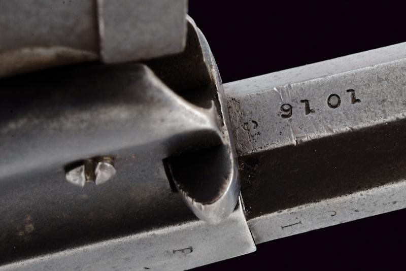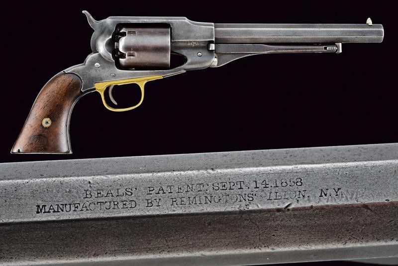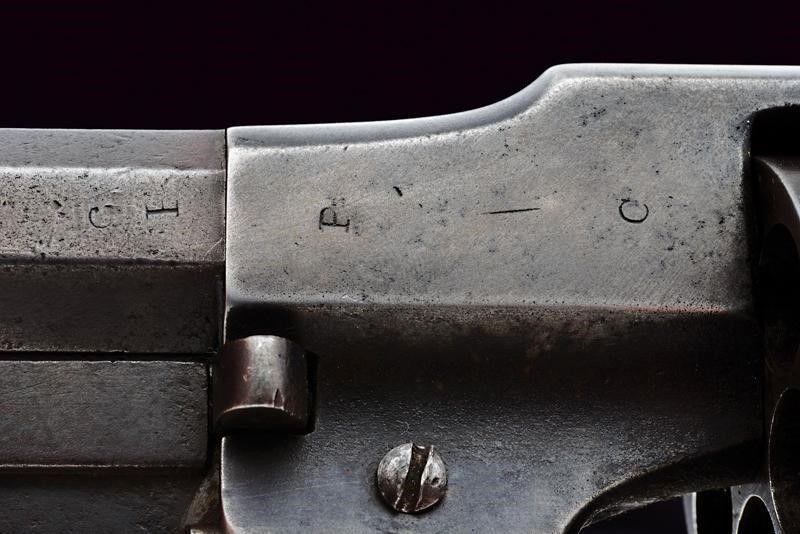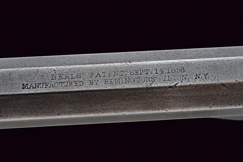 USA, lunghezza 35 cm. 1861 - 1862 Canna ottagonale rigata da 8' (anima in buono stato, rigatura visibile), dotata di mirino conico, recante al dorso la marcatura in due righe standard con il brevetto Beals, con punzoni 'C' e 'P', cal. 44. Tamburo a sei colpi punzonato senza punzoni e con patina lievemente differente. Meccanica ben funzionante. Ponticello in ottone con punzone 'S'. Castello punzonato 'C' e 'P'. Qualche segno d'uso e del tempo. Forse una riparazione alla cresta del cane. Matr. '10xx' su canna e impugnatura. Guancette in legno, quella destra con tracce di un timbro non chiaramente leggibile (ispezione militare?)