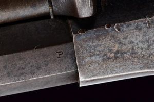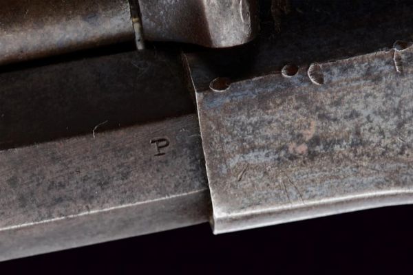 USA, lunghezza 35,5 cm. 1863 - 1875 Canna ottagonale rigata da 8' (anima in buono stato, rigatura visibile), dotata di mirino, recante al dorso la marcatura in tre righe standard con dicitura 'NEW MODEL', con punzoni 'D' e 'P', cal. 44. Tamburo a sei colpi punzonato 'C' e 'H'. Meccanica ben funzionante. Ponticello in ottone. Qualche segno d'uso e del tempo. Tracce di brunitura antica color blu. Matr. '104xxx' su canna e impugnatura. Guancette in legno, quella sinistra con resti di timbro d'ispezione militare.