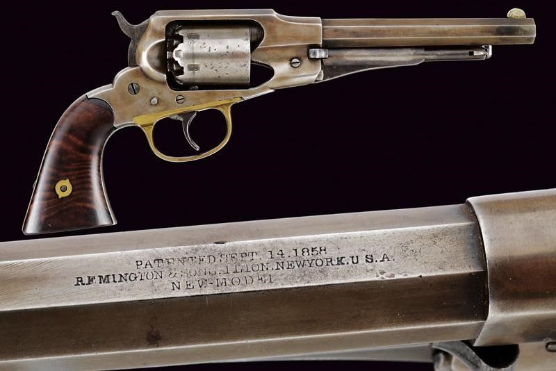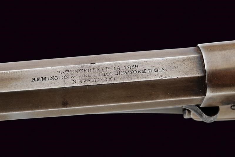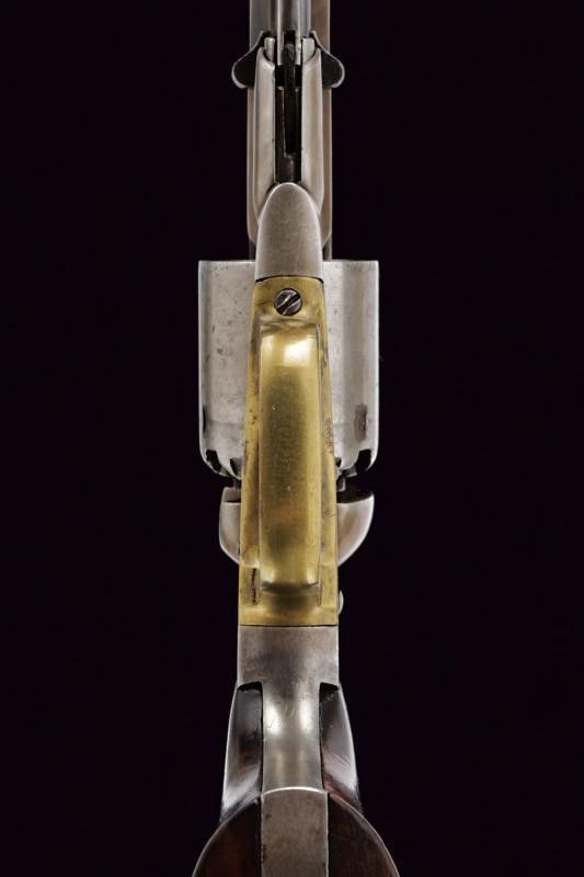 USA, lunghezza 30 cm. 1863 - 1873 Canna ottagonale rigata da 6-1/2' (anima con lievi segni d'uso, rigatura visibile), dotata di mirino a semicerchio, recante al dorso la marcatura del secondo tipo in tre righe con 'NEW MODEL', cal. 36. Tamburo a sei colpi. Meccanica funzionante. Ponticello in ottone. Qualche segno d'uso e del tempo soprattutto al tamburo e al cane. Matr. '47xx' su canna (non chiaramente visibile, ma probabilmente coeva) e impugnatura. Qualche traccia di finitura (antica?). Guancette in noce.