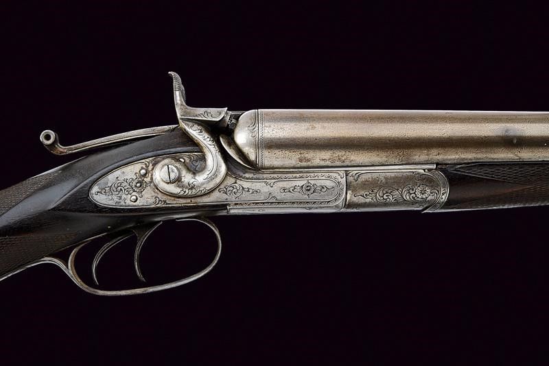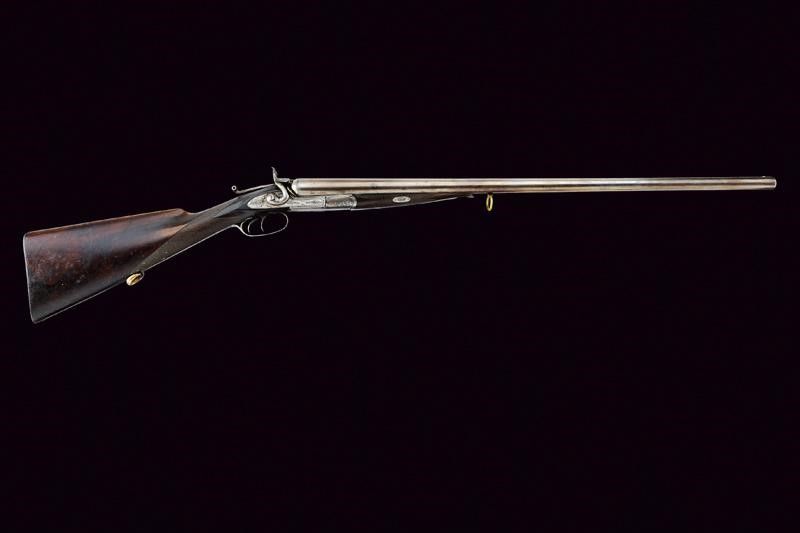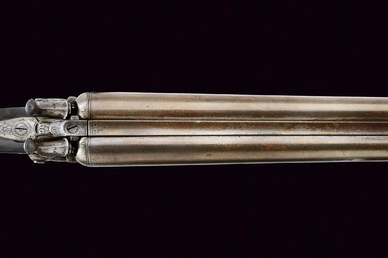 1874 - 1876 Canne tonde, lisce (anime pulite) in damasco, la bindella marcata 'E. REMINGTON & SONS ILION. N.Y.', la base incisa, mirino in ottone, cal. 12. Codetta con apertura 'Remington-Whitmore Lifter Action', incisa e marcata 'A.E. WHITMORE'S PATENT AUG. 8. 1871 - APRIL 16 1872'. Batterie a molla in avanti finemente incise a motivi floreali con cani del modello 1874. Calcio ed astina in legno zigrinato con fornimenti in ferro decorato en suite. Rara.