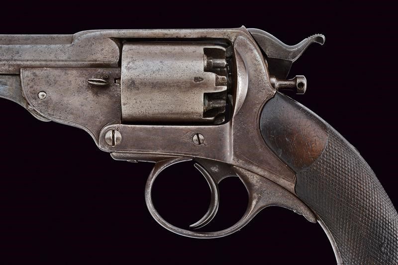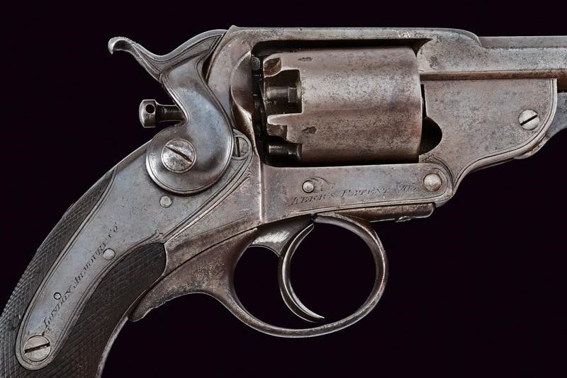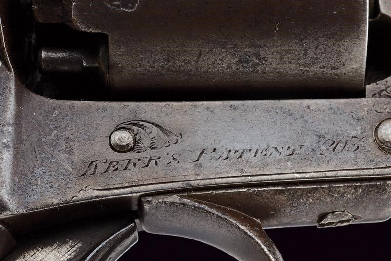Londra, lunghezza 29,5 cm. 1860-70 Canna faccettata, rigata (un po' di pitting all'interno, rigatura visibile), con mirino a cuspide in metallo bianco, recante al dorso resti di marcatura 'LONDON'; cal. 36. Tamburo a cinque colpi con punzoni del banco di prova di Londra. Meccanica funzionante in singola azione. Castello con resti di dicitura 'KERR'S PATENT' e tracce di numerazione (forse 203?), timbro 'LONDON' e resti di incisioni. Batteria a molla indietro con marcatura 'LONDON ARMOURY CO.' Intaccature. Impugnatura zigrinata in legno.