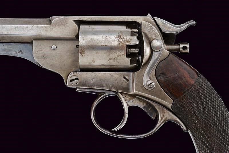 1860-70 Canna faccettata, rigata (anima pulita, rigatura visibile), con mirino a cuspide in ottone, cal. 44. Tamburo a cinque colpi con punzone 'AF' coronato, timbro del banco di prova di Liegi, resti di matricola coeva al castello. Meccanica funzionante in singola azione. Castello con resti di marcatura del brevetto Kerr e matr. '107xx'. Batteria senza marcature. Impugnatura in legno zigrinato. Anello porta correggiolo. Lievi tracce di finitura in alcuni punti.
