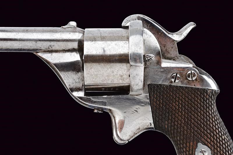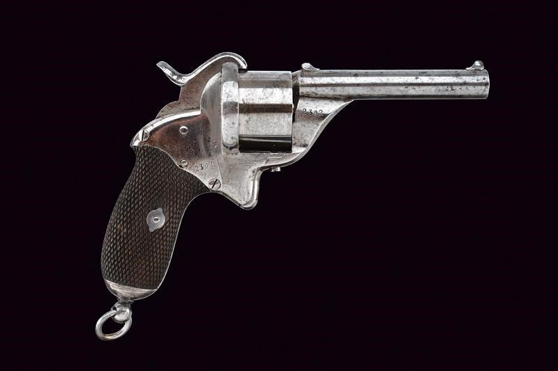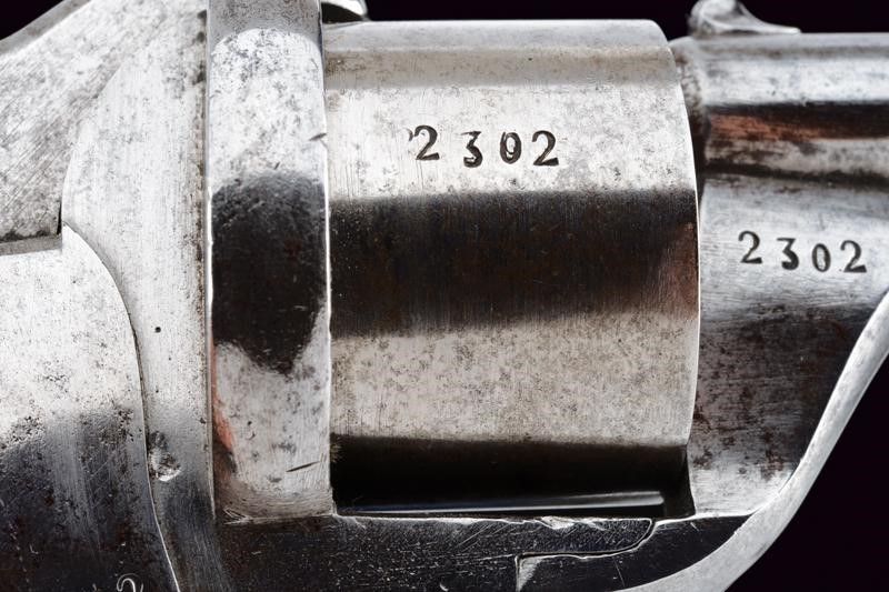 Stato Pontificio, lunghezza 21 cm. Canna tonda rigata, munita di traguardo e mirino, cal. 9 mm. Tamburo liscio a sei colpi numerato '23xx'; castello in ferro marcato en suite, dotato di sportellino di caricamento sul fianco sinistro. Impugnatura con guancette in legno zigrinato e anello di sospensione.