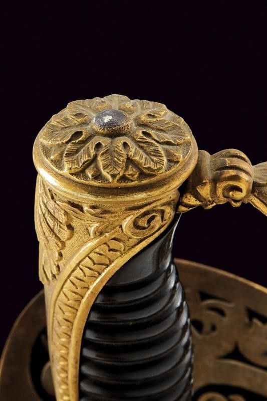 Europa, lunghezza 83 cm. Lama leggermente curva con dorso a bacchetta e jelman (piccole aree con pitting). Bel fornimento in ottone dorato con trafori a racemi e Ă ncora coronata, guardia intagliata con ricciolo, impugnatura in corno bruno a spire, cappetta in ottone dorato con piccoli intagli a squame e conchiglia. Fodero in cuoio nero con bei fornimenti dorati, ancora coronata e conchiglia a rilievo sopra il puntale.