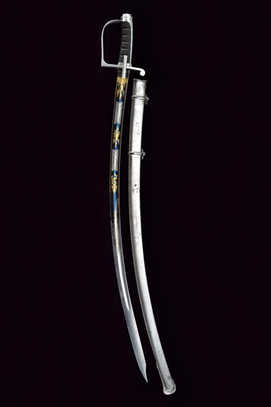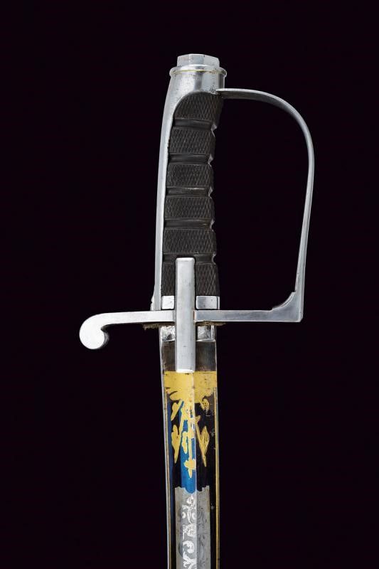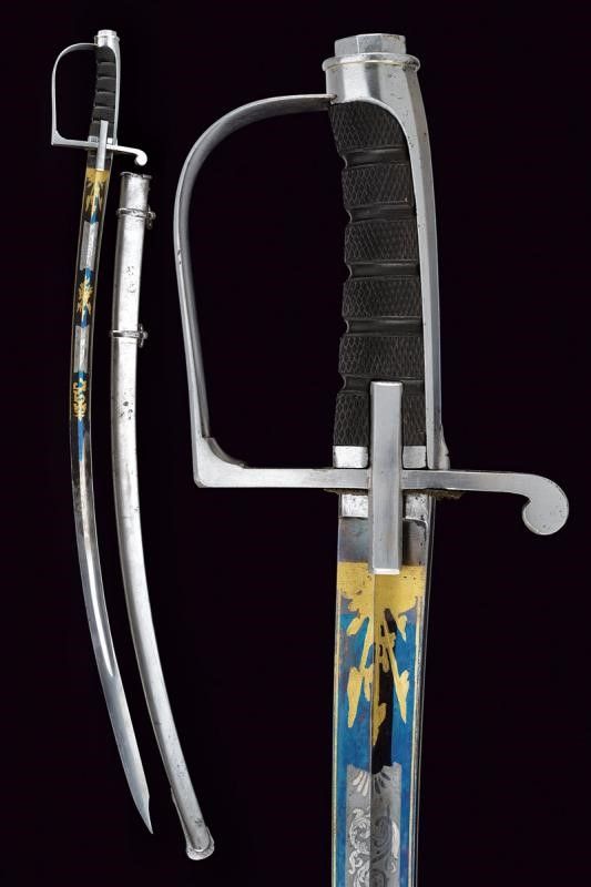 Italia, lunghezza 98 cm. Lama leggermente curva a un filo e controfilo con ampio sguscio, recante nella prima parte eleganti incisioni a settori in parte dorate su fondo blu a trofei e racemi. Tallone con punzone tedesco. Fornimento monoelso di tipica foggia, in ferro. Impugnatura in ebano zigrinato e lavorato a settori. Fodero in ferro a due campanelle.