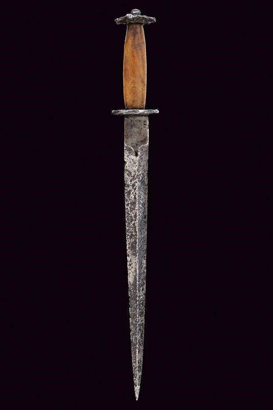 XV Sec. Lama dritta di sezione triangolare, ampie zone recanti danni da ruggine; tallone piatto e rettangolare. Impugnatura in legno con elso a disco traforato ed inciso a raggi. Bel pomo a stella. Raro.
