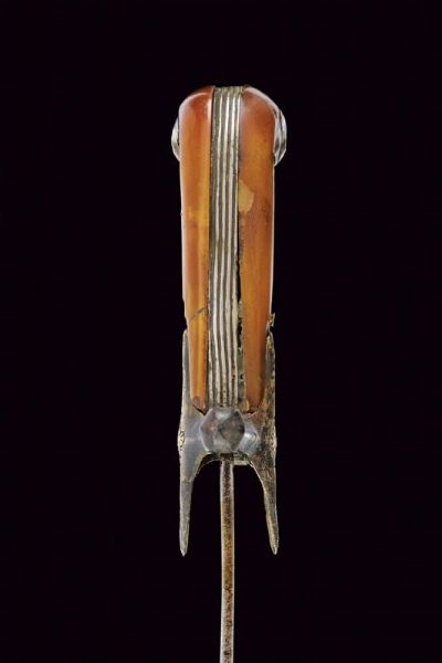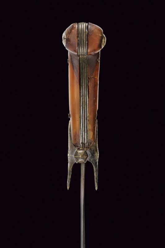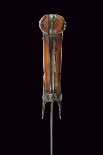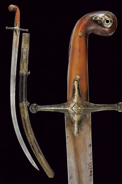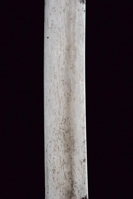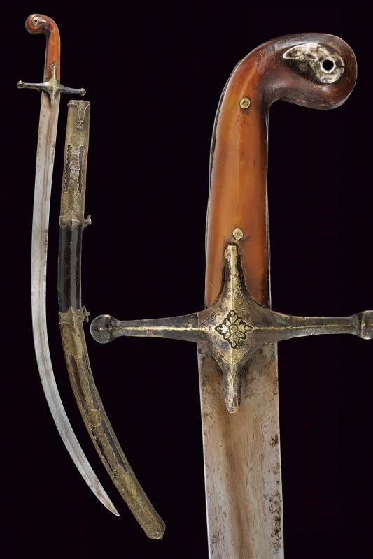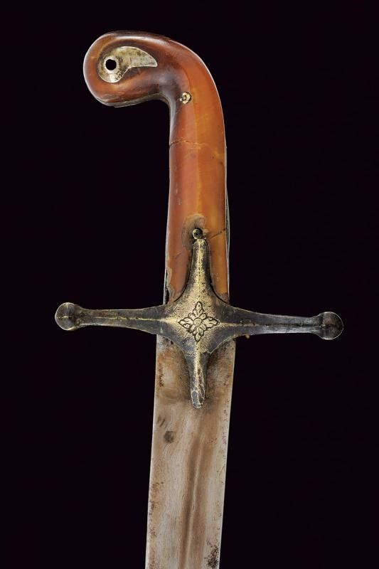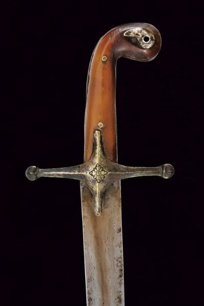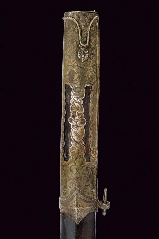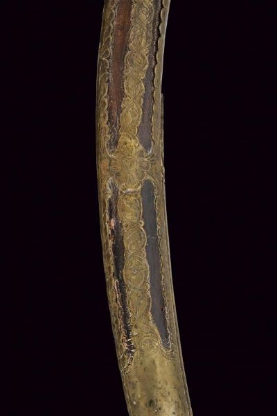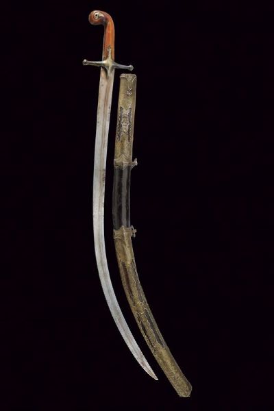 Turchia, lunghezza 90 cm. Metà del XIX Secolo Lama curva, piatta, a un filo, in damasco. Fornimento in argento con elso a croce e guancette in corno (difetti e piccole mancanze). Fodero in legno rivestito di cuoio cucito in filo metallico; fornimenti in argento incisi a motivi floreali. Due anelli di sospensione. I fornimenti in patina gialla, da pulire.