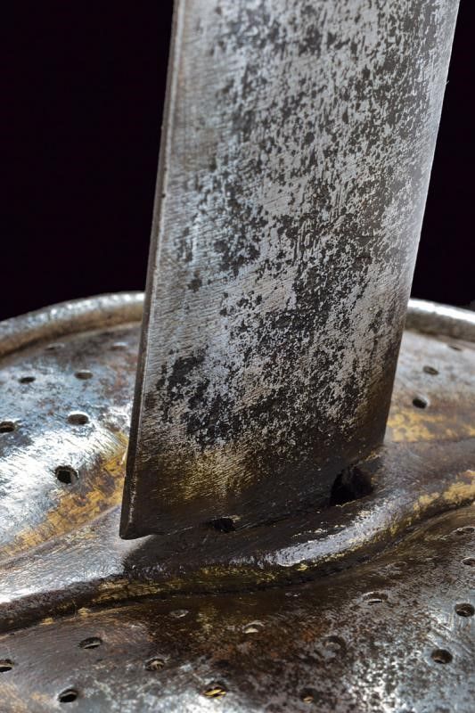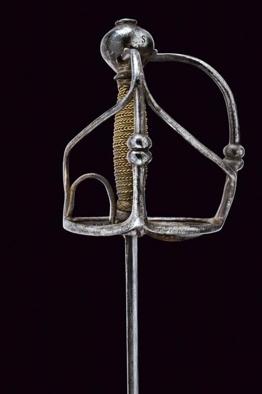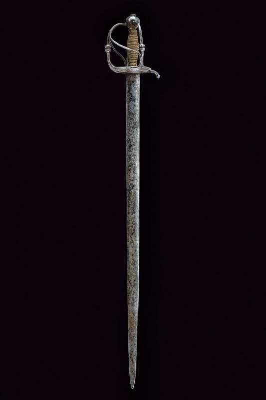 ultimo quarto del XVII Sec. Lama di media larghezza, dritta, a due fili, di sezione lenticolare. Fornimento in ferro a due valve traforate, quattro rami di guardia di cui due decorati decorati a doppio nodo, anello da pollice, pomo a vaso marcato 'S' e con firma 'G. QUALLIEUR'. Impugnatura in legno, rivesta con trecciola e dotata di teste di moro, in filo d'ottone.