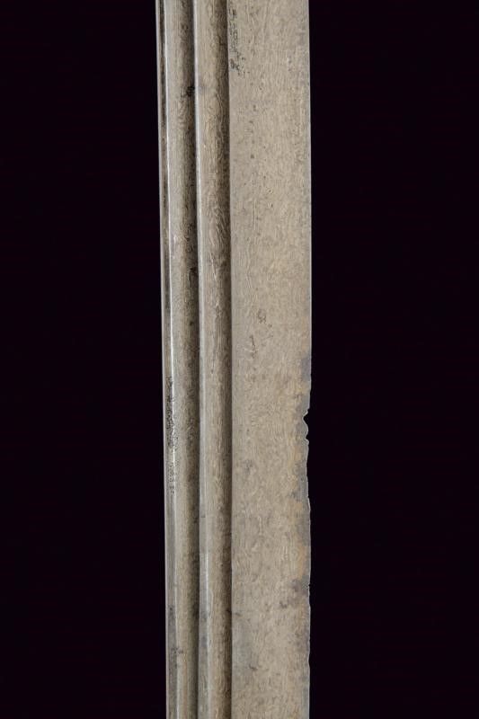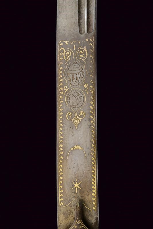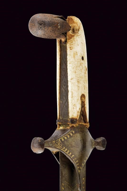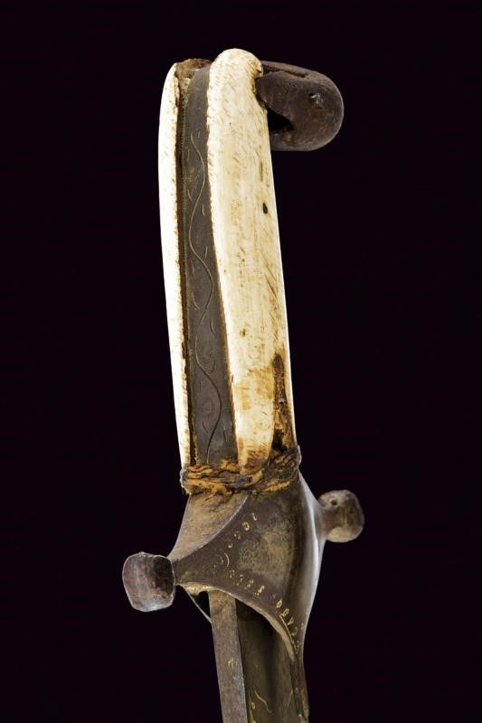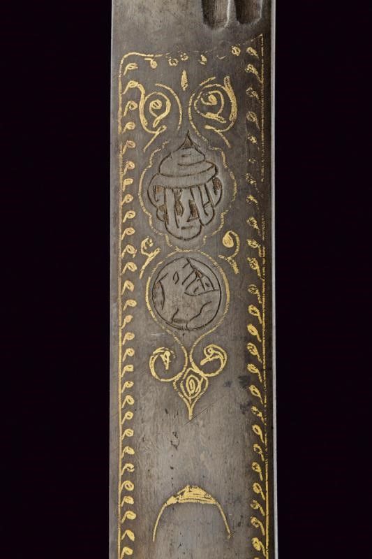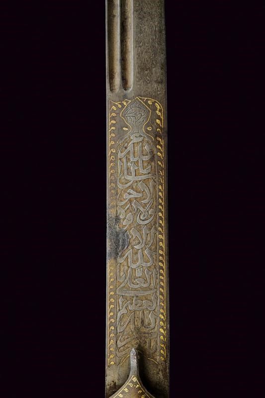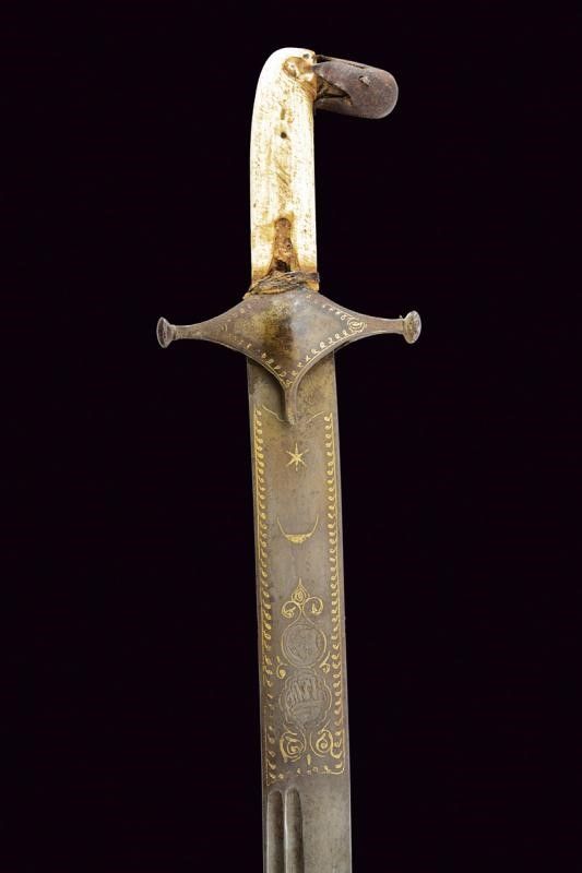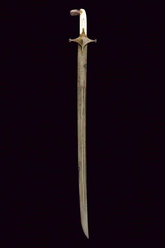 Siria, lunghezza 94 cm. fine del XVIII Sec. Lama dritta ad un filo, in fine damasco Wootz, con duplice scanalatura accanto al dorso. Su un lato del tallone l'iscrizione 'La hawla wa la quwwata illa Billah al layul azim' 'Non c'è forza se non da Allah'. Sull'altro lato il cartiglio con leone stilizzato, tipico della produzione di Assad Allah; il tutto tra decori e cornicette rimesse in oro. Tipica guardia in probabile in damasco, sempre con cornicette in oro, impugnatura a pistola con guance in osso di cammello. Piccoli danni.