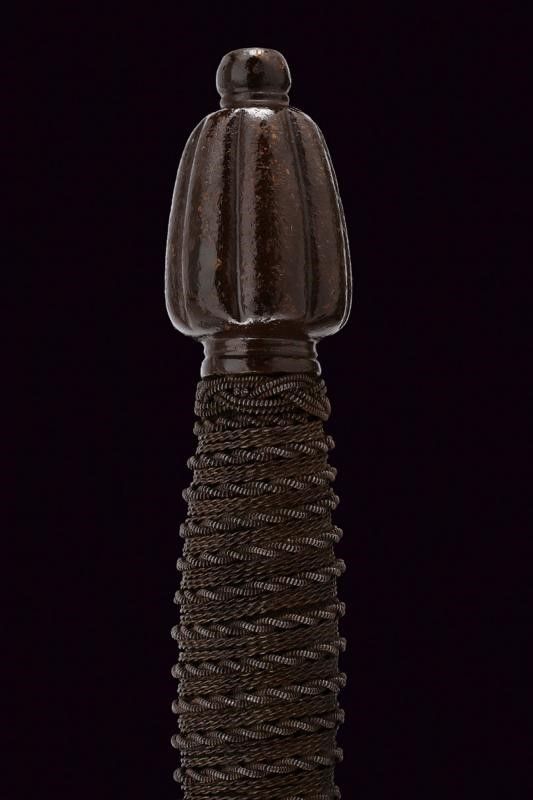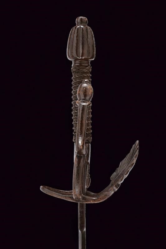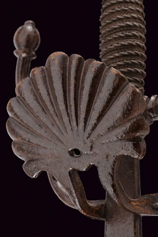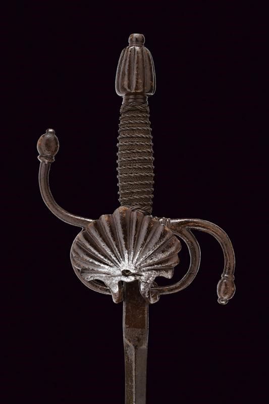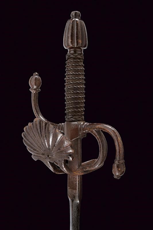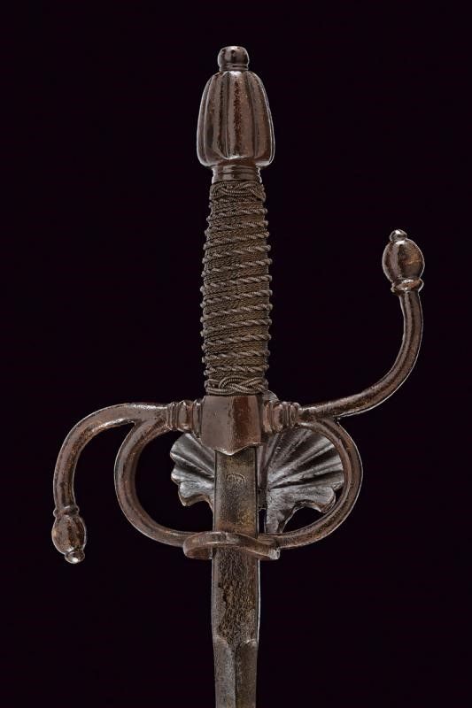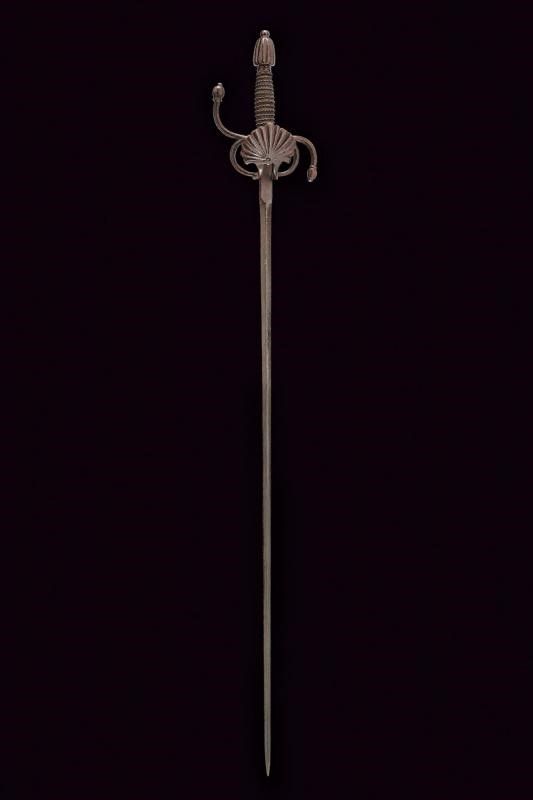 Italia, lunghezza 105 cm. XVI-XVIII Secolo Lama dritta di sezione a losanga con tallone piatto (lama settecentesca di origine francese). Bel fornimento da spada italiana in ferro. Ponticello con coccia a palmetta, bracci dell'elso a 'S' con estremità a nodi ovali. Pomo con scanalature longitudinali. Impugnatura in legno con bel rivestimento in trecciola e con teste di moro in filo di ferro.