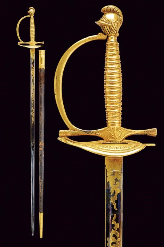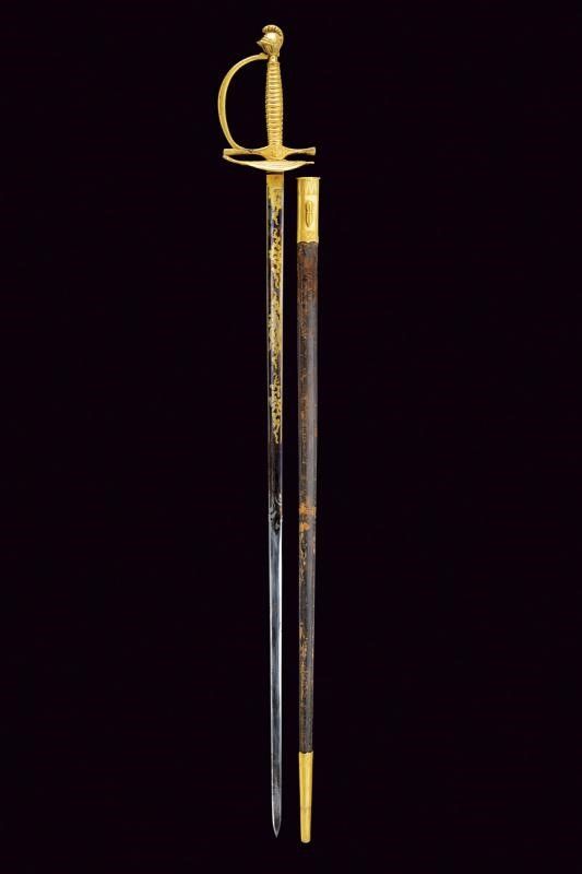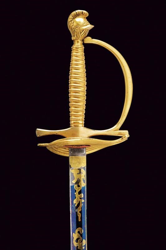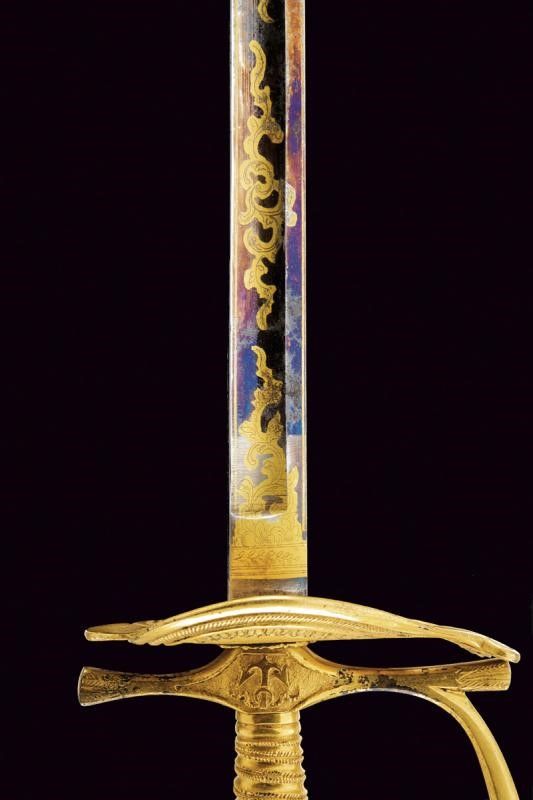 Europa, lunghezza 99 cm. Lama dritta a un filo e controfilo, prima sgusciata poi di sezione lenticolare, la prima parte finemente incisa e dorata a trofei e motivi floreali su fondo blu. Fornimento monoelso in ottone dorato con piccola pelta, il massello con Ă ncora senza corona. Pomo a elmo piumato, impugnatura massiccia. Fodero in cuoio con fornimenti in ottone dorato ed inciso. Forse austriaca.