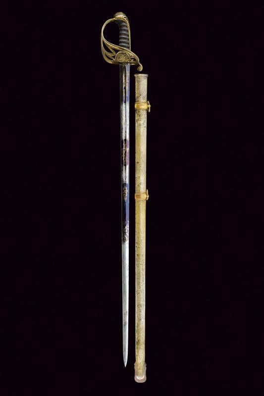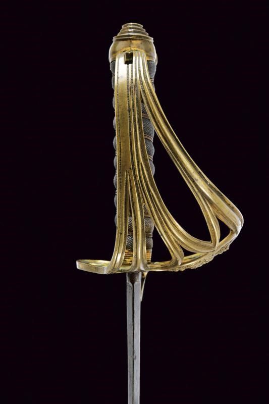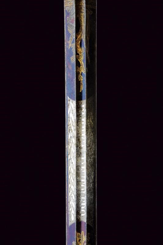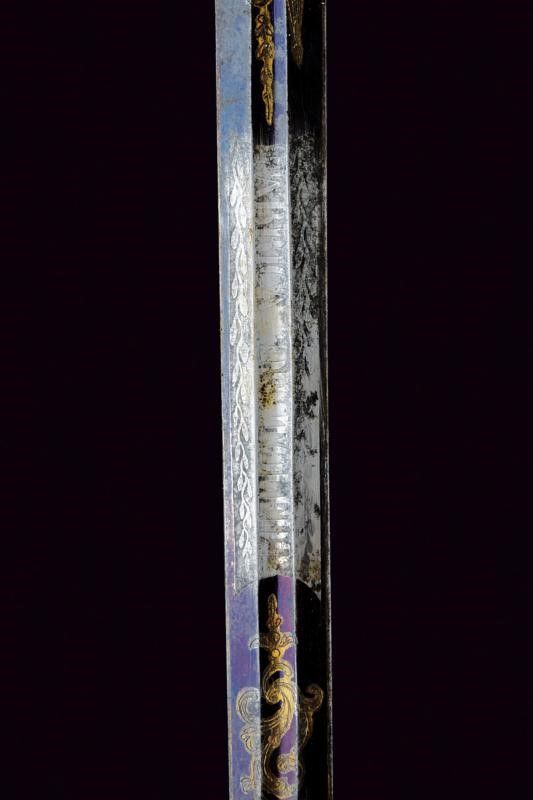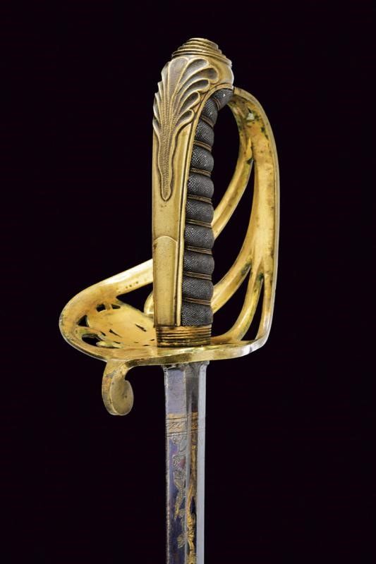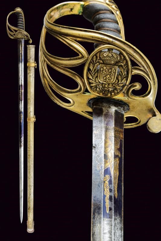 Regno delle Due Sicilie, lunghezza 99.5 cm. Lama dritta a due fili di sezione lenticolare, sgusciata al forte. Nella prima parte tre elementi incisi e dorati a trofei e fiorami su fondo blu, alternati a due segmenti non bruniti, il primo di questi recante anche l'iscrizione 'FABRICA DE TOLEDO' su entrambi i lati. Fornimento in ottone traforato, con resti di doratura, recante bello scudo borbonico operato in rilievo e a traforo, sormontato dalla corona reale, posto dentro un serto di quercia. Impugnatura rivestita in pelle di pesce con avvolgimento di trecciola e filo di rame. Cappetta lunga decorata a palmetta. Fodero in metallo a due campanelle con fascette dorate in bronzo.